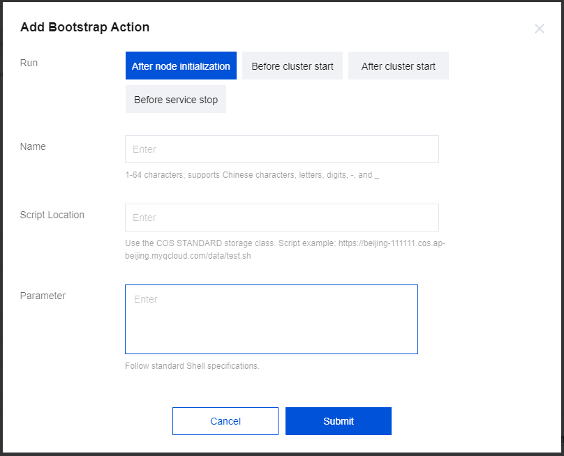 1. Log in to the EMR console and click the ID/Name of the target cluster in the cluster list to enter the cluster details page. Then, choose Basic information > Bootstrap Actions and click Add Bootstrap Action. 2. Edit or delete the added bootstrap action as needed. Select a time for running the script and enter relevant parameters.
