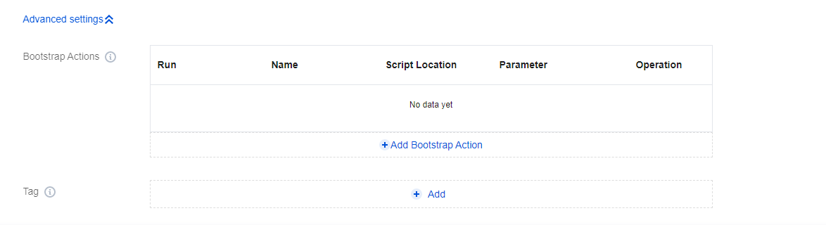 Option 1: Add a bootstrap action when creating a cluster on the purchase page 1. Choose Basic Configuration > Advanced Settings > Add Bootstrap Action to add a bootstrap action.