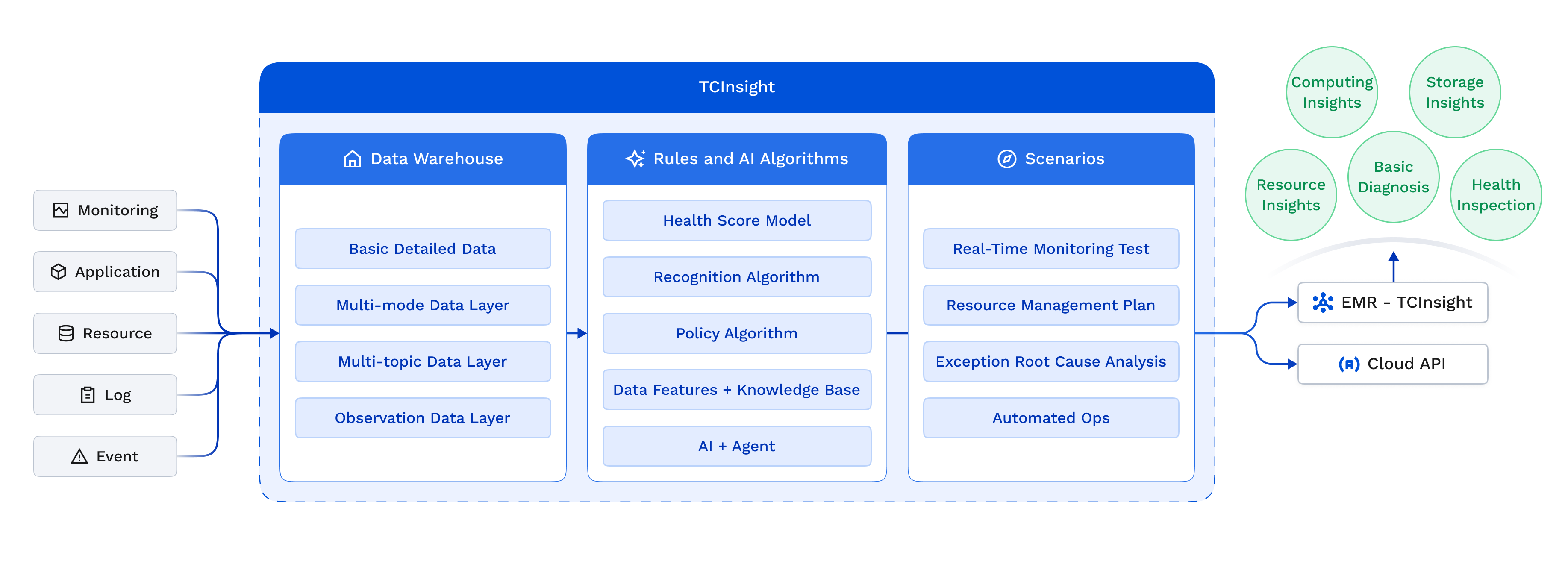 TCInsight consists of 3 components: an Ops data warehouse, rules and AI algorithms, and application capabilities tailored to specific scenarios.