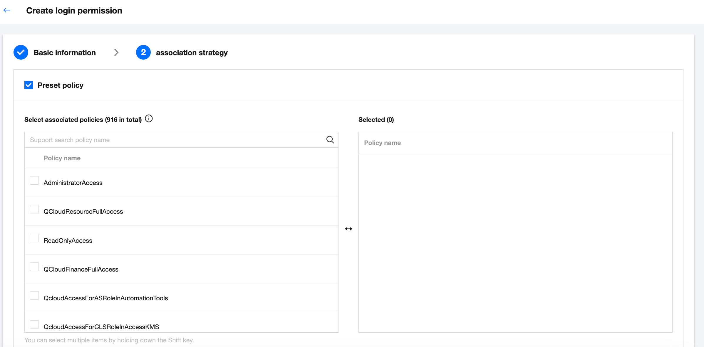 3.2 Select the policy associated with login permissions. Depending on your requirements, you may choose a preset policy or customize your own (both options can be selected simultaneously).