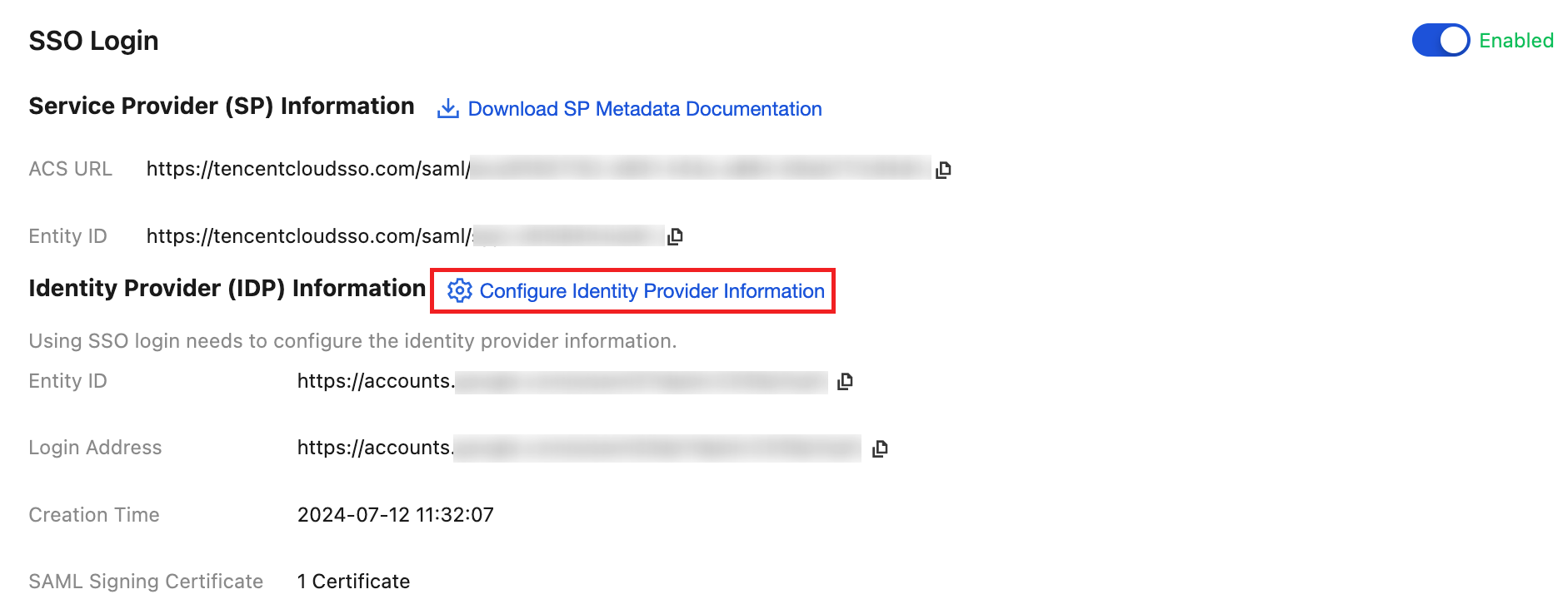 3. SSO login is enabled, and identity provider (IdP) info is configured. For the setting method, see Manage SSO Login. Note: