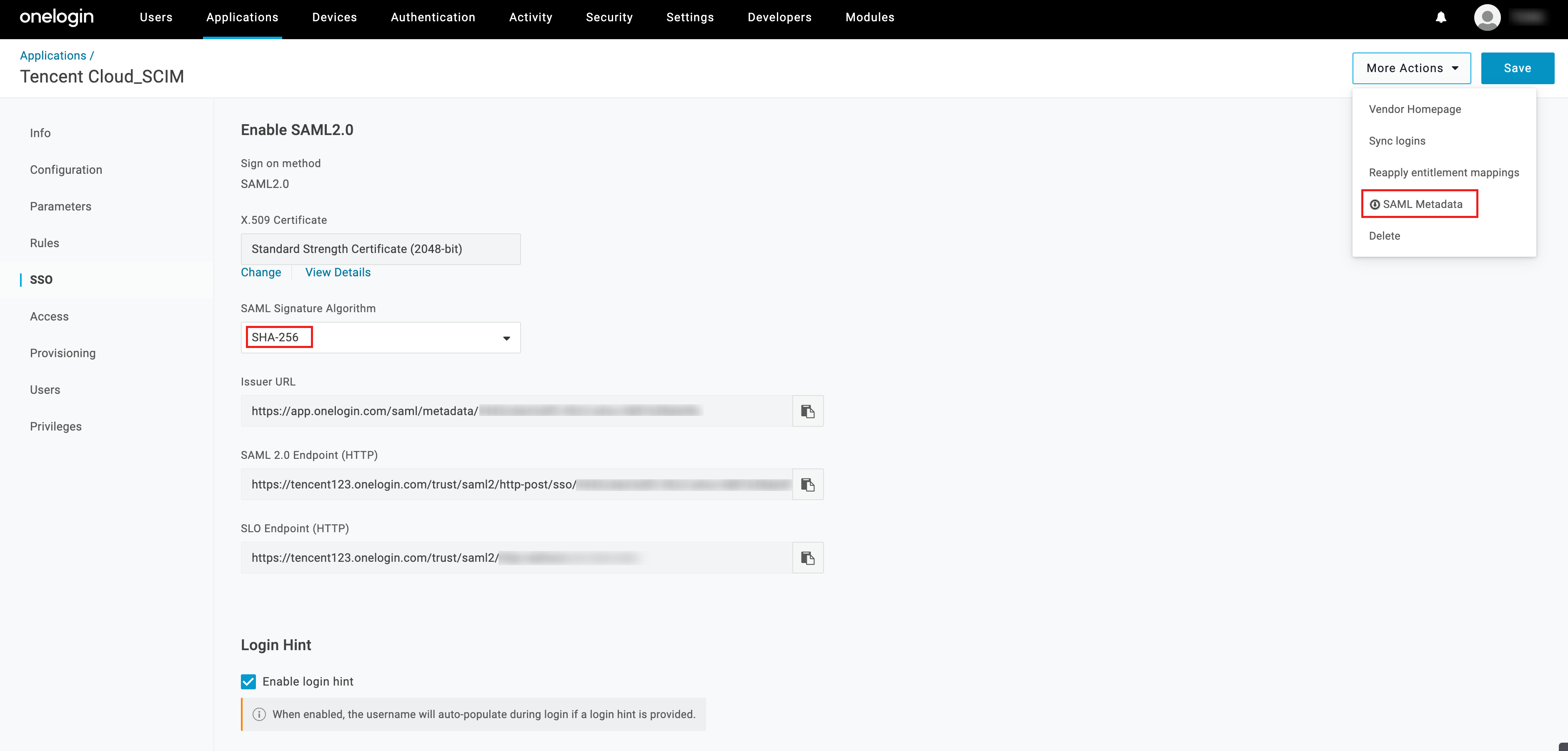 2. On the SSO page, switch the SAML Signature Algorithm protocol to SHA-256 (the default is SHA-1, and the identity center does not support this protocol), then click Save.
