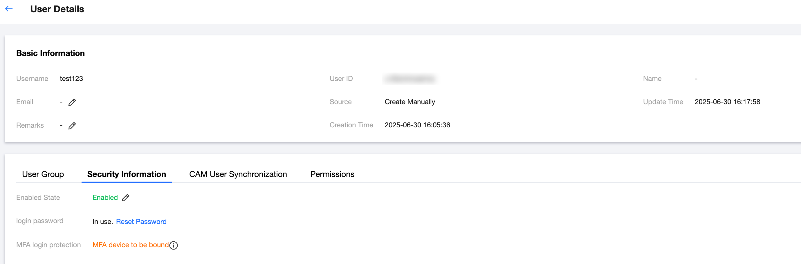 MFA login protection is enabled by default. When an identity center user logs in to the User Portal with username and password, and the MFA login protection status is MFA device to be bound, they will be required to add an MFA device.