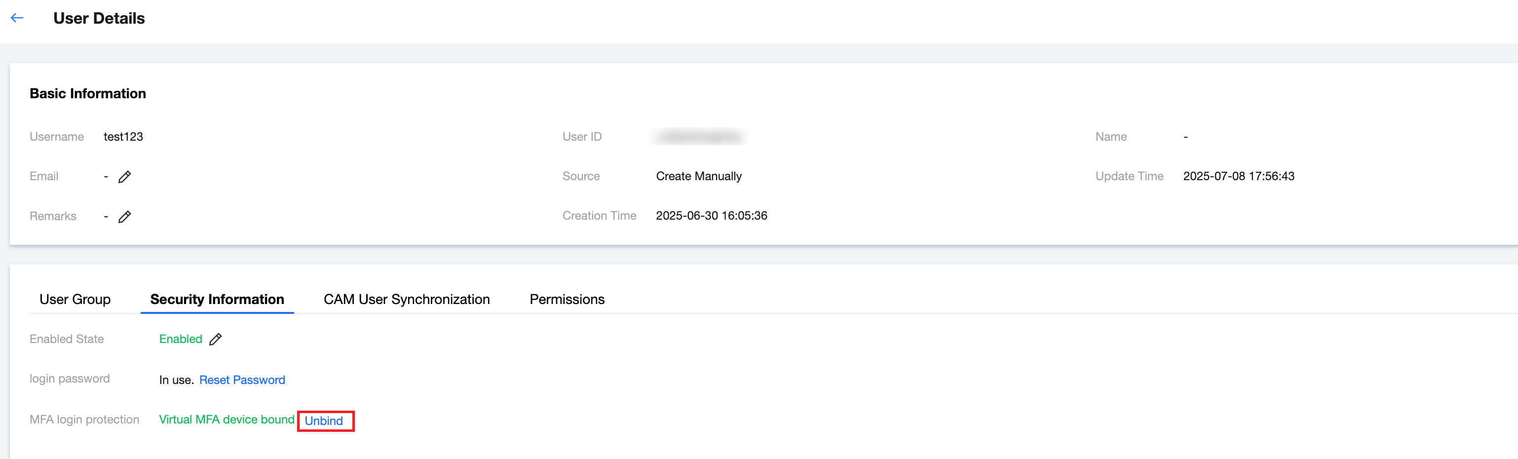 4. Click the Security Information tab, then click Unbind under MFA login protection.