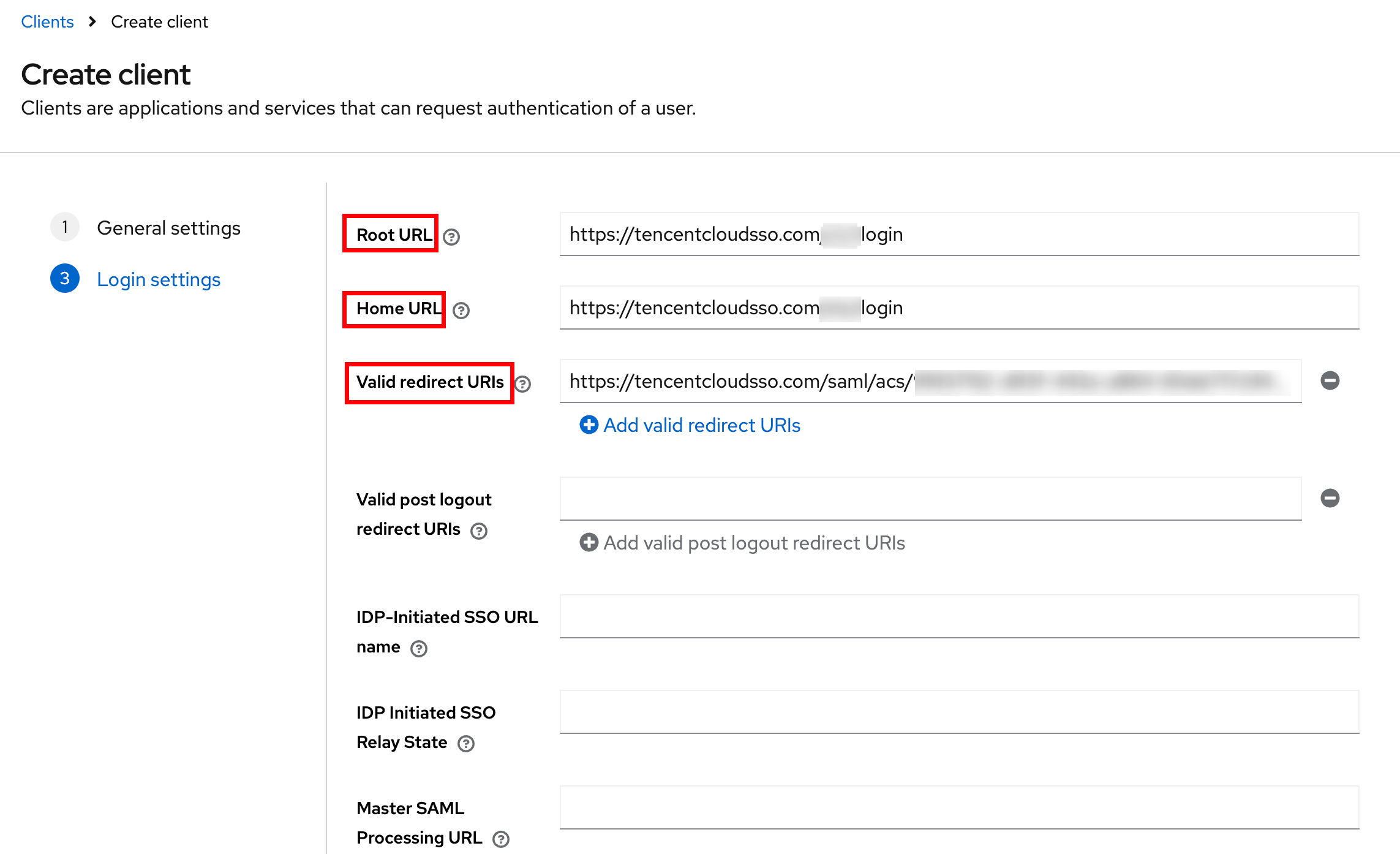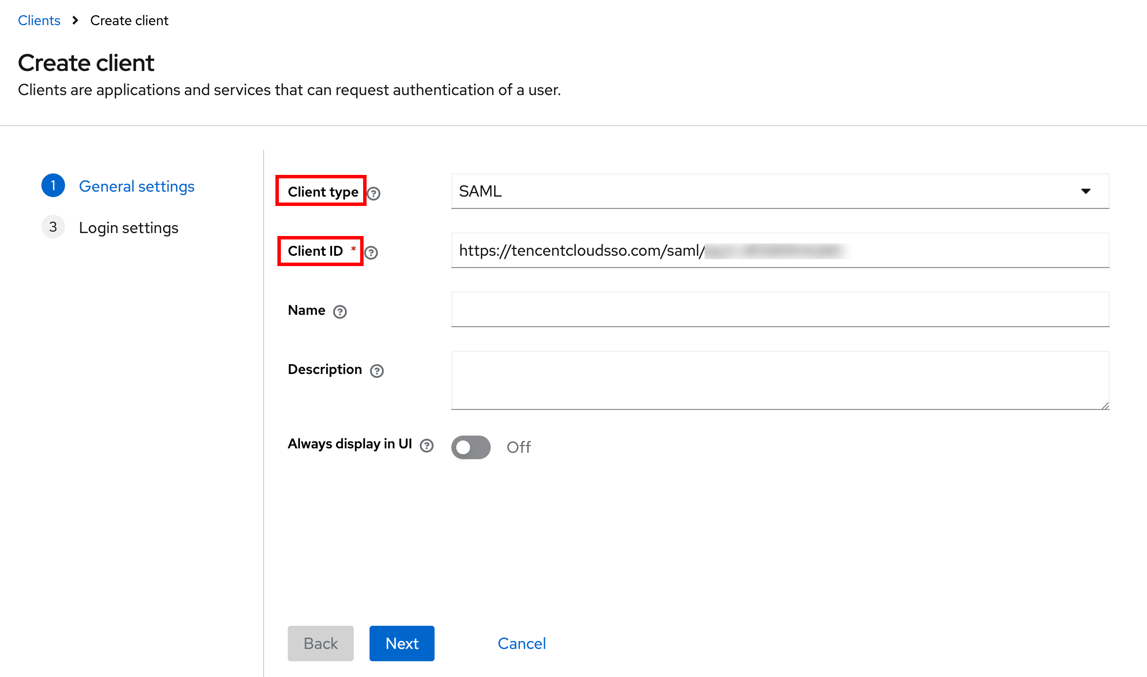 2. On the General settings page, select SAML for Client type, enter the Entity ID obtained from the identity center in step two for Client ID, and click Next. 3. On the Login settings page, fill in the following information, click Save to complete the configuration in Keycloak.
