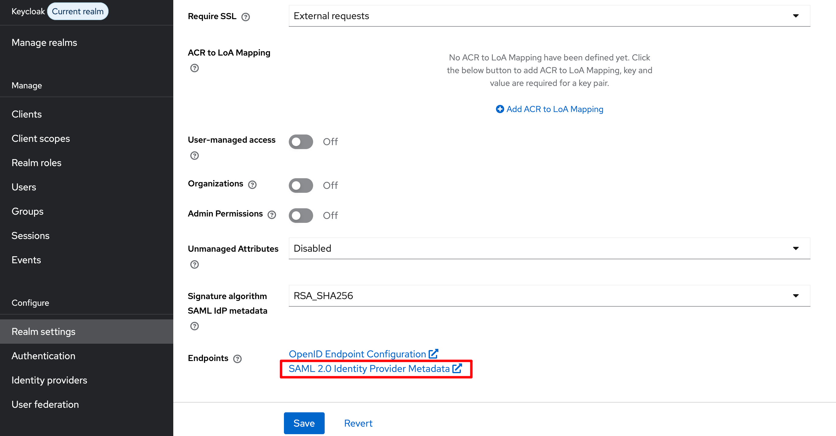 1. On the Configure > Realm settings page, open the SAML 2.0 Identity Provider Metadata link from the webpage.