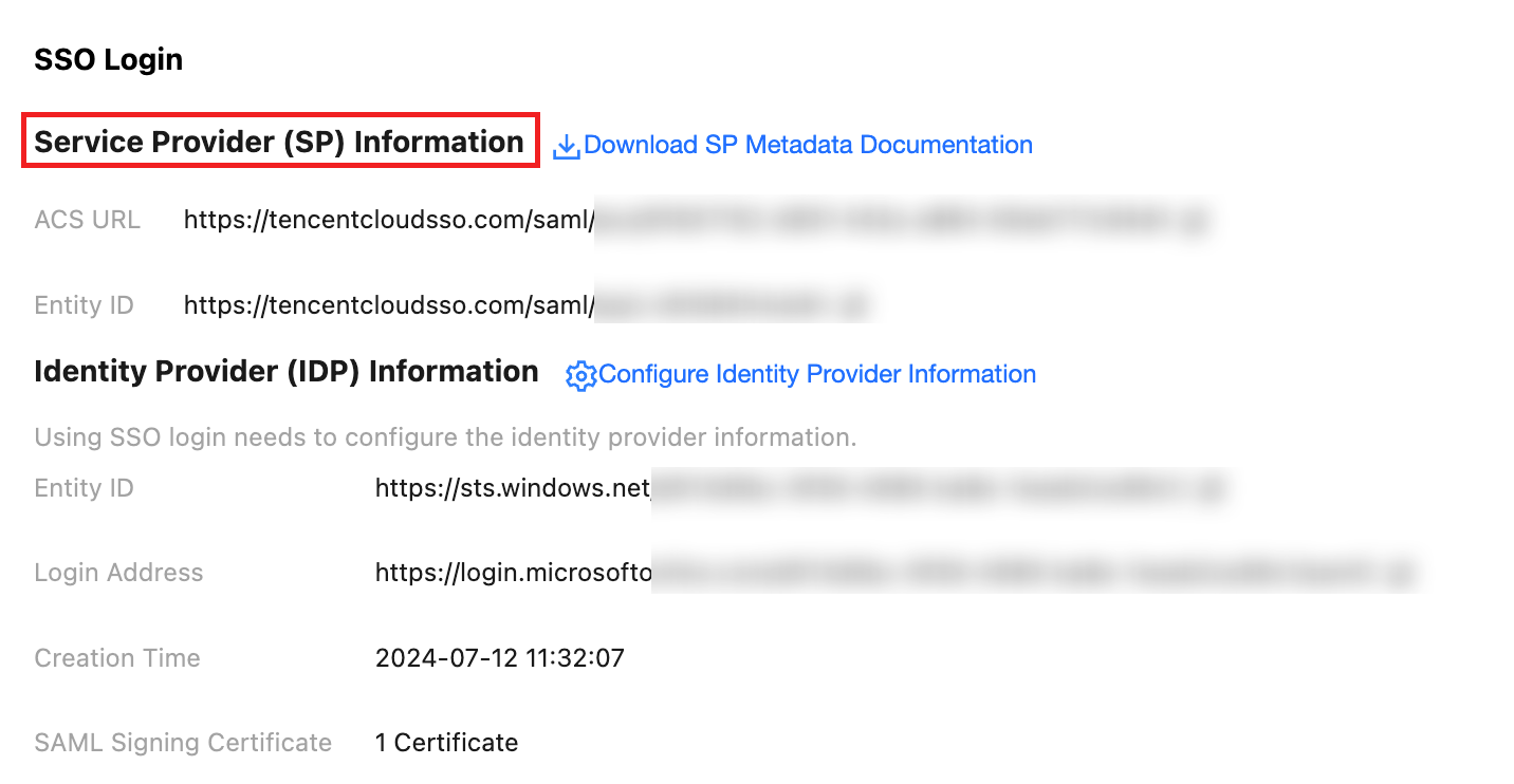 1. Log in to Tencent Cloud Organization > Identity Center Management > User Management > Settings page. 2. In the SSO Login section, click , then click Enable in the popup window to enable SSO login. Step 2: Copy Service Provider (SP) Info