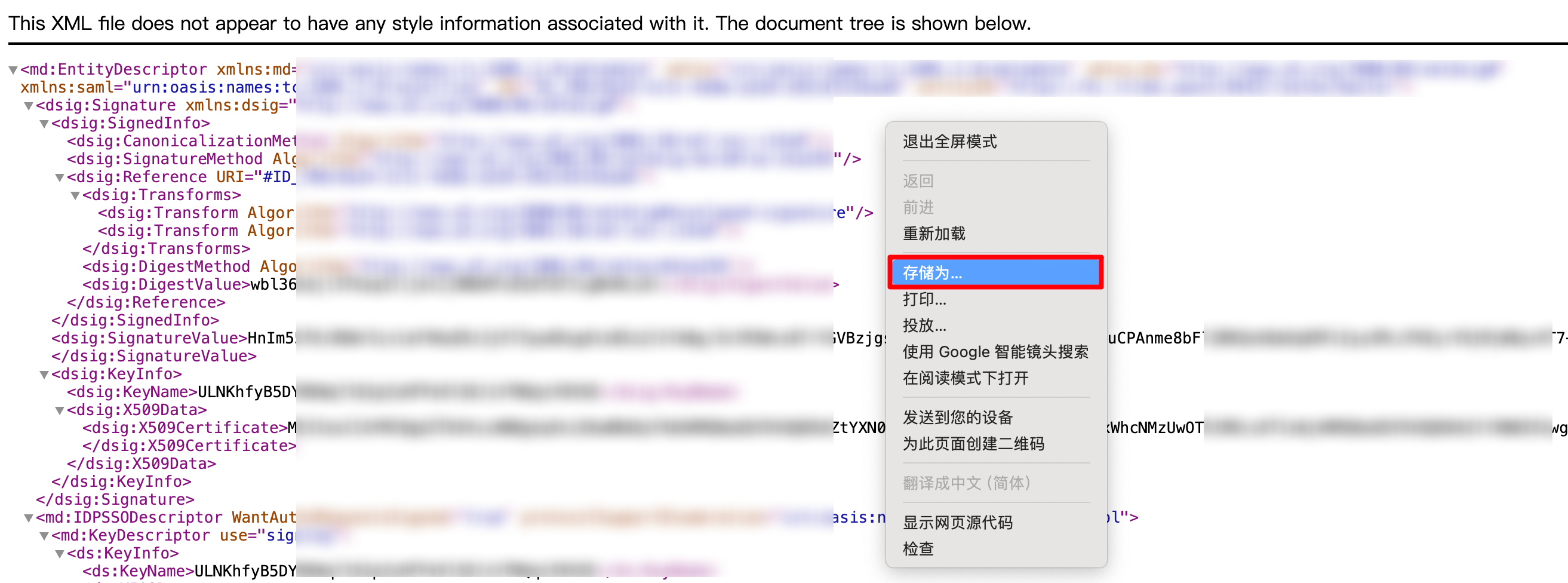 2. In the opened web page, right-click Save as to store it as a local file, obtaining the metadata XML document.