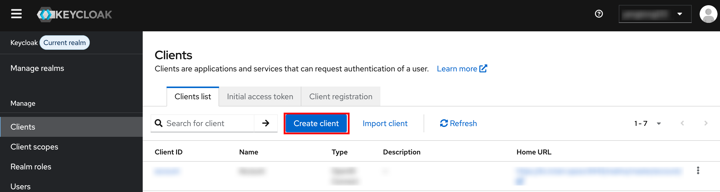 1. Log in to Keycloak as an administrator, go to the Manage > Clients page, click Create client, and proceed to the configuration page.