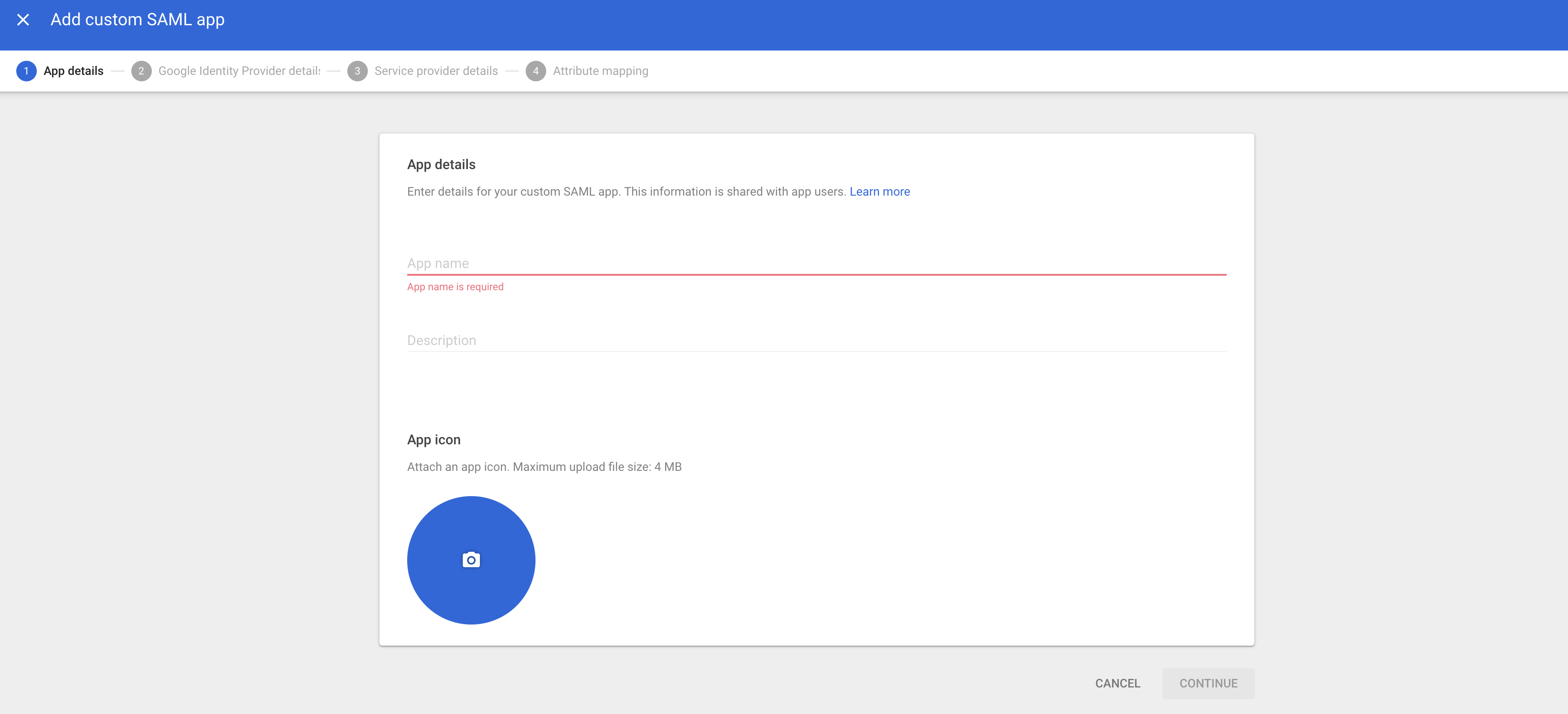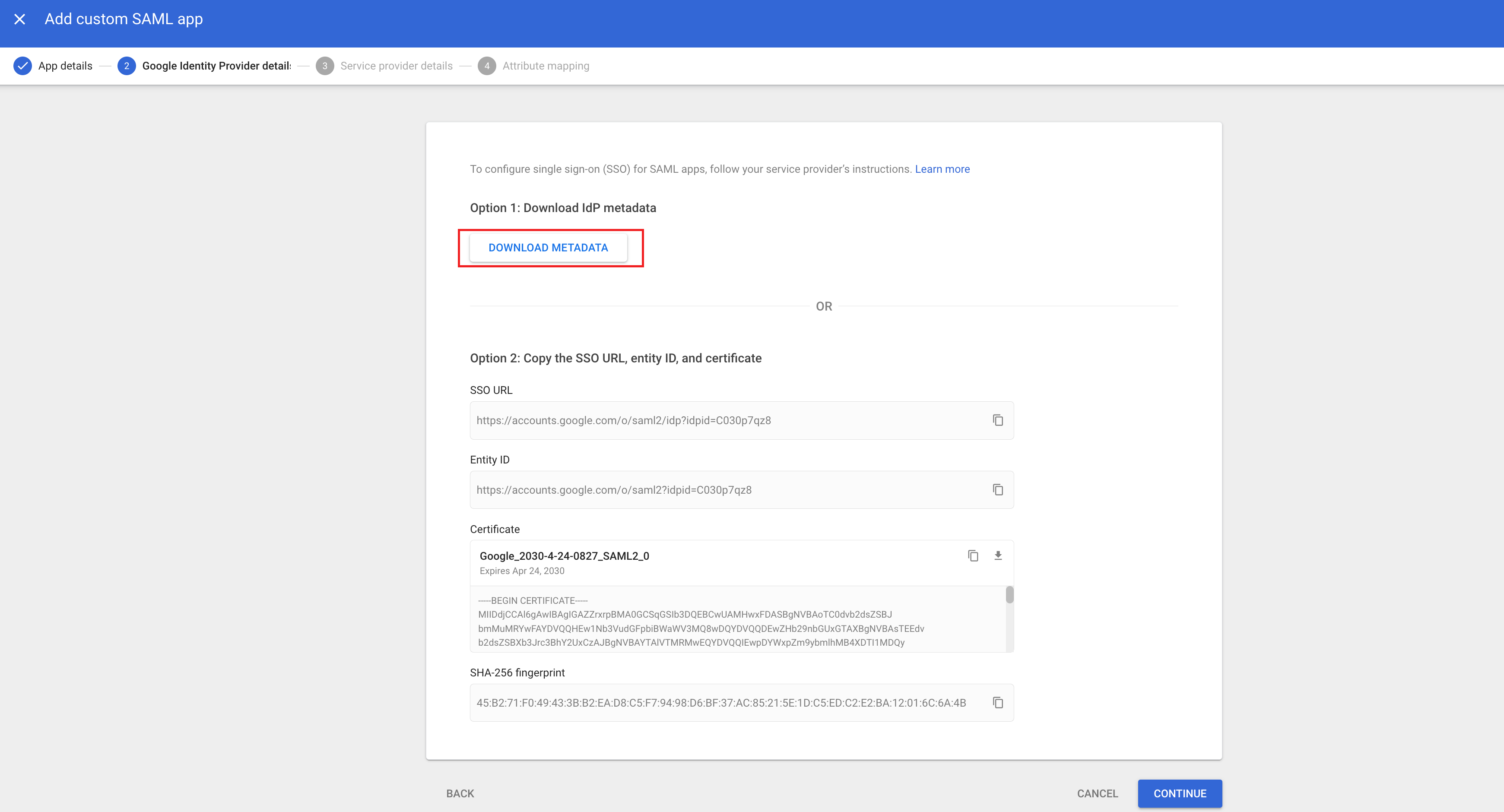 3. Click DOWNLOAD METADATA to download the metadata XML document, then click CONTINUE.