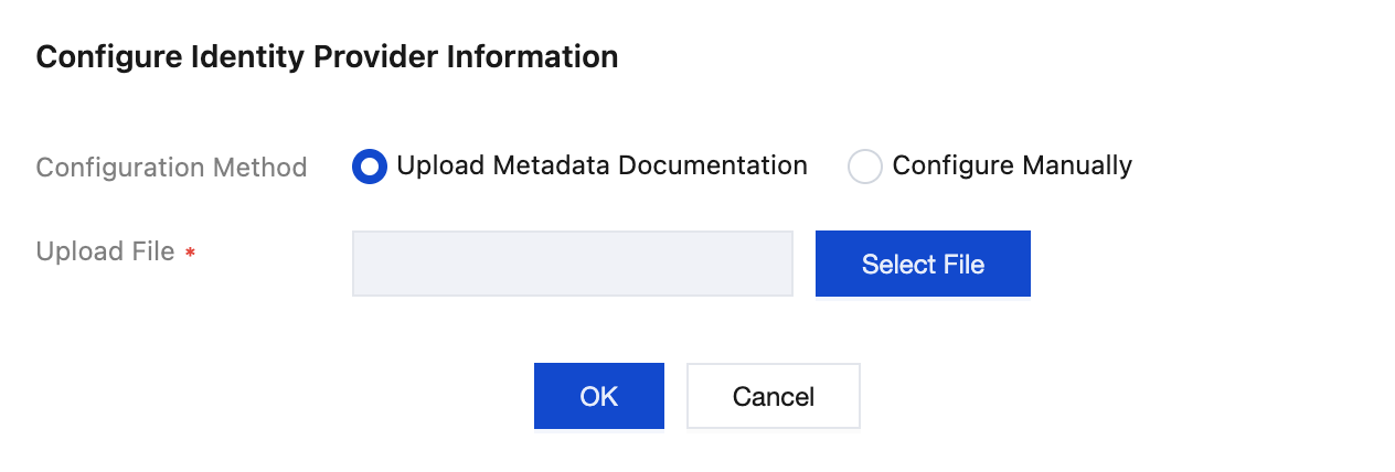 1. In the Organization Account Management > Identity Center Management > Settings > SSO Login Identity Provider (IDP) Information section, click Configure Identity Provider Information. 2. Click Select File to upload the Federation Metadata XML document downloaded from Google Workspace.