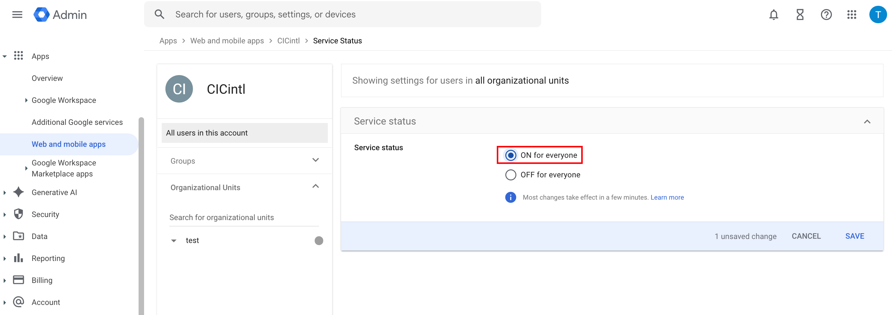 7. In the Service status module, select ON for everyone, then click SAVE.