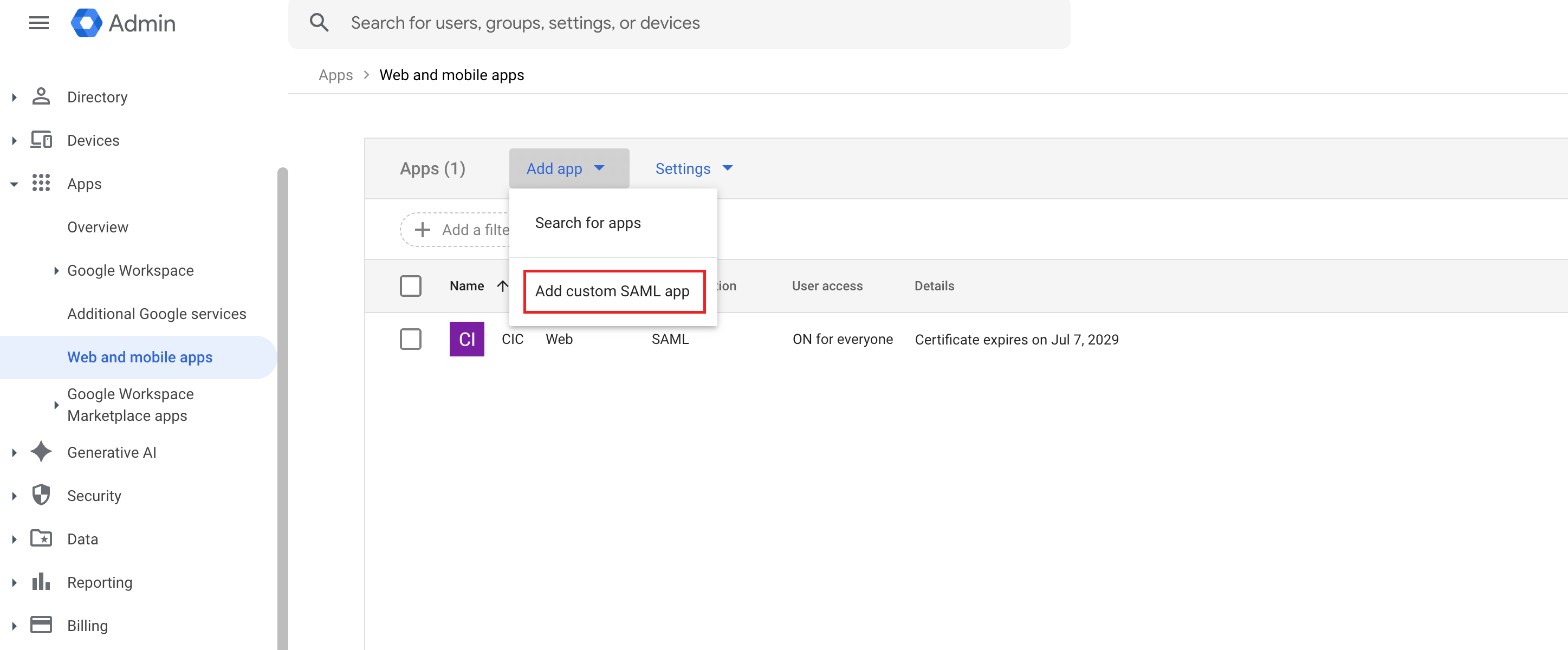 1. The admin enters Google Workspace, in the left sidebar, select Apps > Web and mobile apps, click Add app on the page, and select Add custom SAML app.