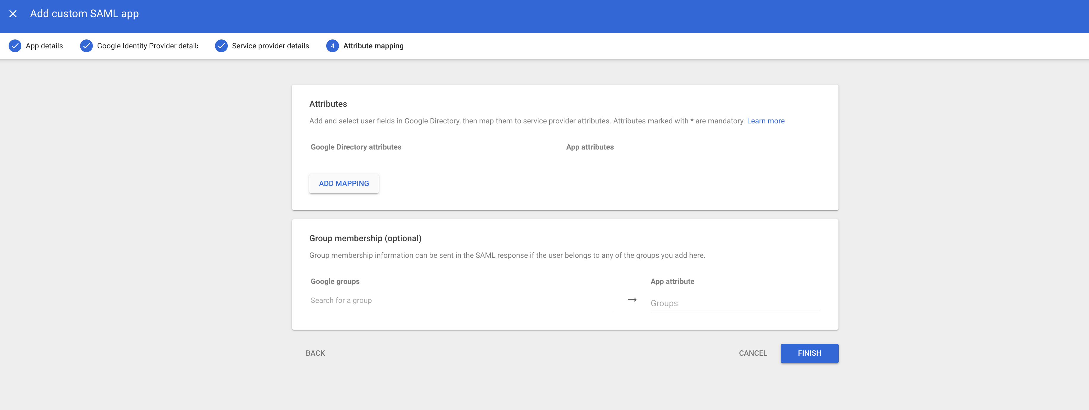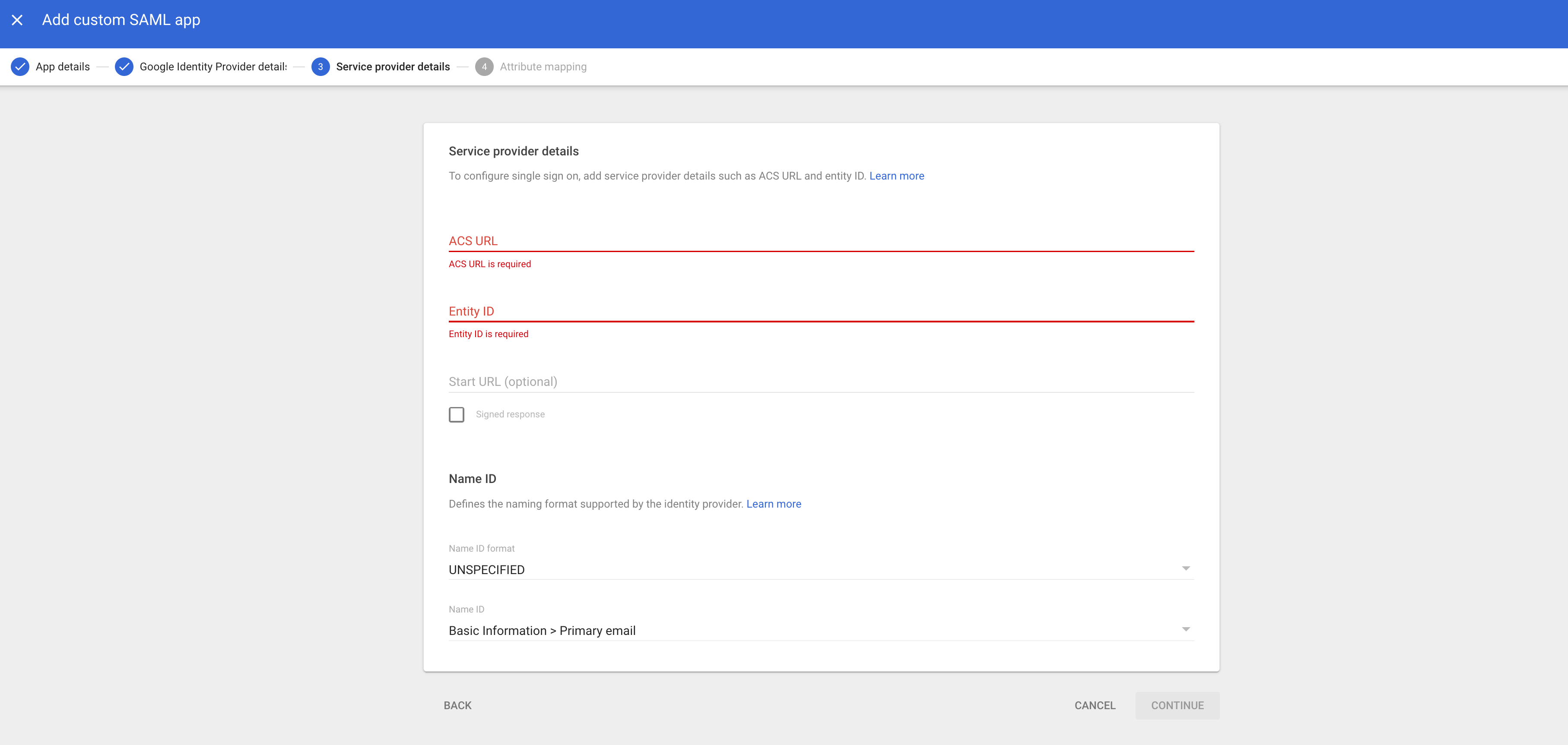 4. At ACS URL, fill in the ACS URL obtained from the identity center in step 2. At Entity ID, fill in the Entity ID obtained from the identity center, then click CONTINUE. 5. Click FINISH to complete the creation.