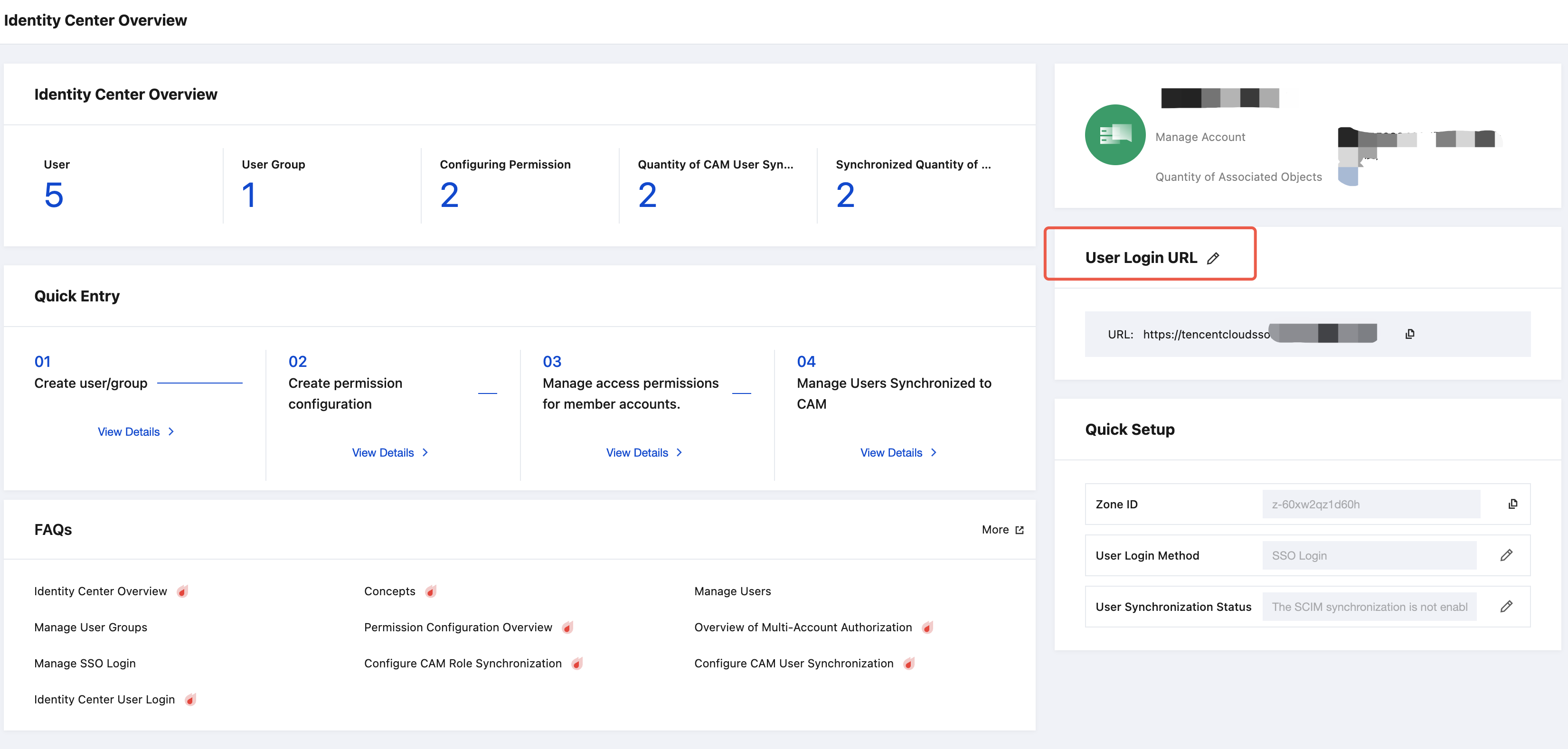 1. The Identity Center administrator enters Organization Account Management > Identity Center Management > Identity Center Overview page on the right to view and copy the User Login URL. 2. Click to access the User Login URL, then click Login.