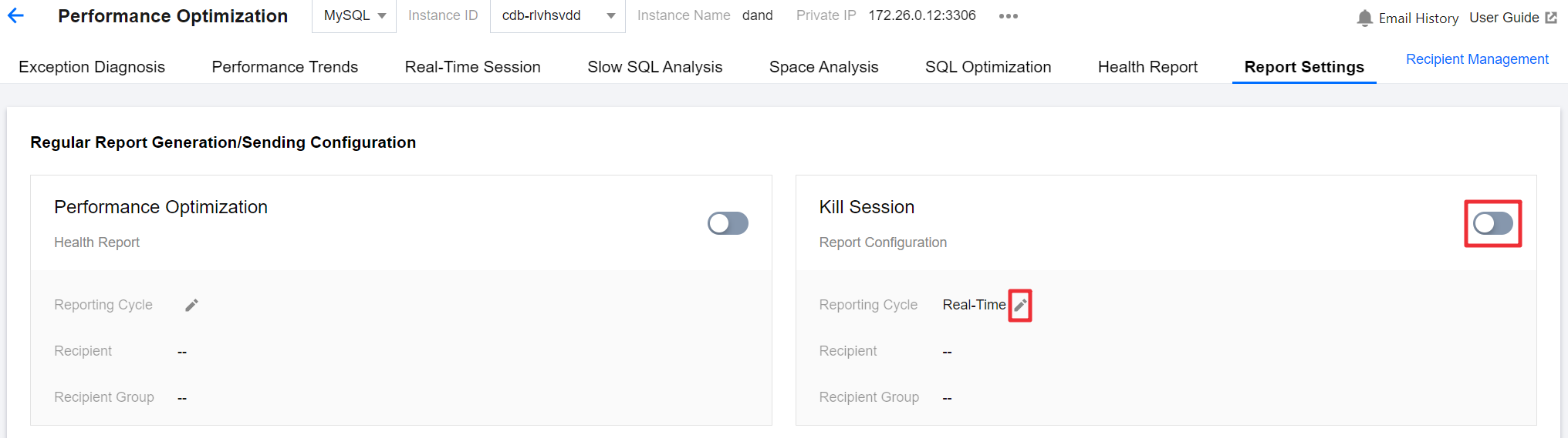 4. Enable the Kill Session Report switch, and click on the right side of the receive cycle option. 5. In the pop-up dialog box, enable Send to Specified Email Address, select a contact or contact group, and click OK. The generated health report will be sent to the specified contact or contact group email.