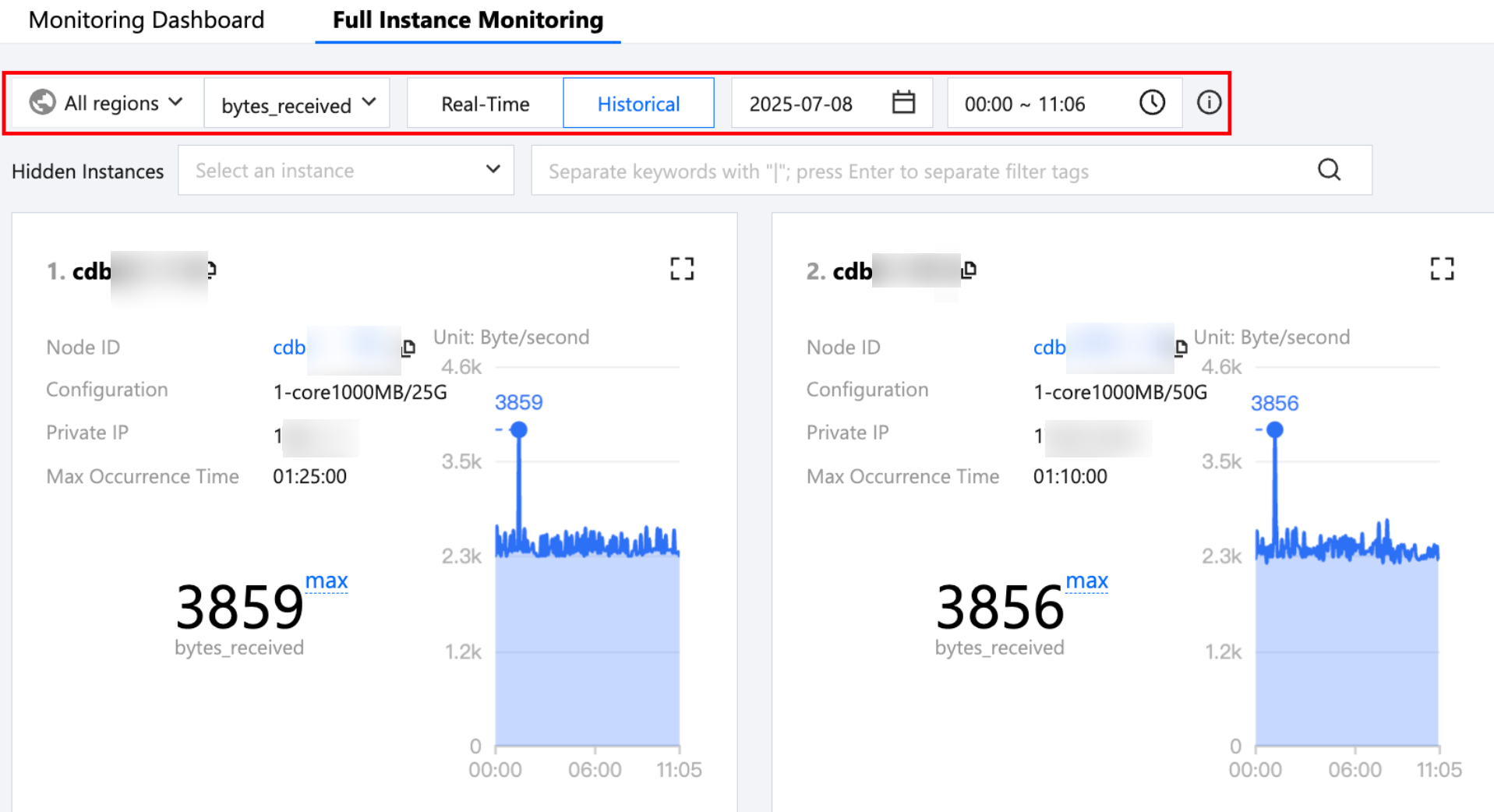 View the full instance monitoring dashboard: Without filtering or hiding instances, you can view the monitoring information of all instances.
