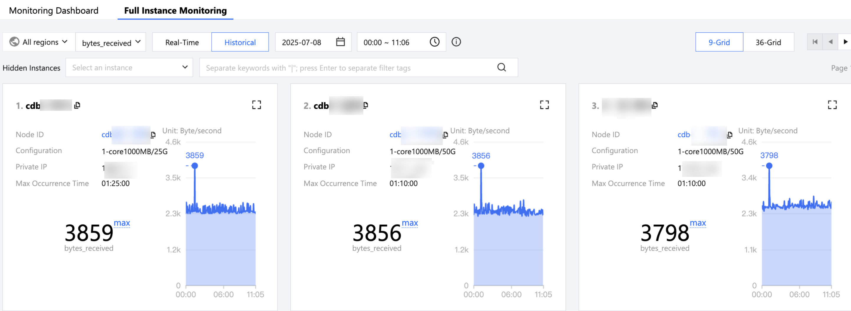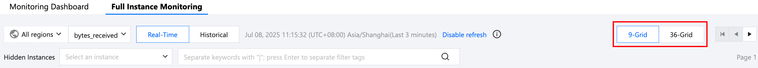 9-grid or 36-grid display of monitoring charts: You can switch between a 9-grid or 36-grid display of monitoring charts in the upper-right corner of the page. For users with many instances, the 36-grid view is recommended for a clearer global perspective and better visibility of metric fluctuations.