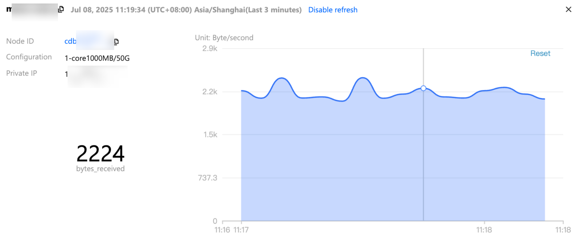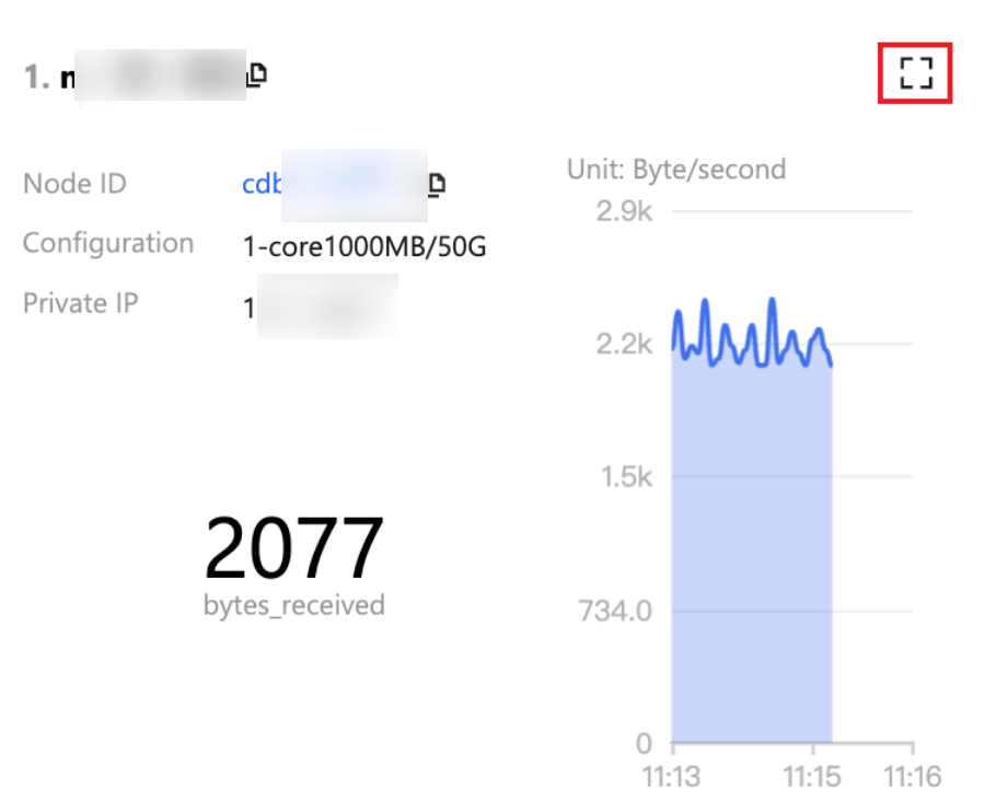 Zoom in for individual monitoring metrics: Click in the upper-right corner of a chart card to view the monitoring data of the instance separately on the pop-up page. View monitoring charts in fine granularity: Drag the mouse within a single trend chart to select the time period to zoom in, and view the trend chart in fine granularity for that period.