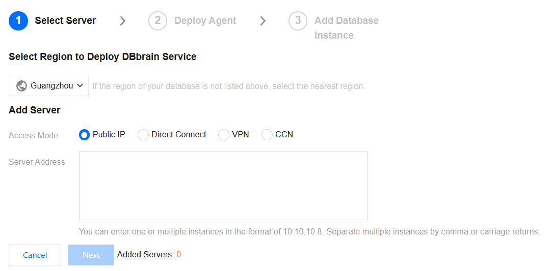 Add Server: Supports adding hosts through public IP addresses, DC, VPN access, and Cloud Connect Network.
