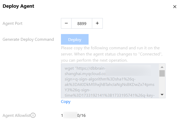 2. In the pop-up dialog box, select the Agent port, click Deploy, and the Agent deployment command will be generated according to the selected port number.