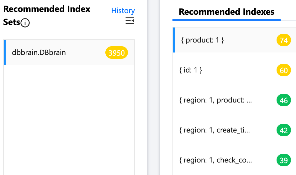 DBbrain aggregates the recommendations based on the detected index data and sorts the indexes by recommendation value. A greater value indicates that the index set contains indexes that require urgent optimization, and their optimization will significantly improve the database performance.