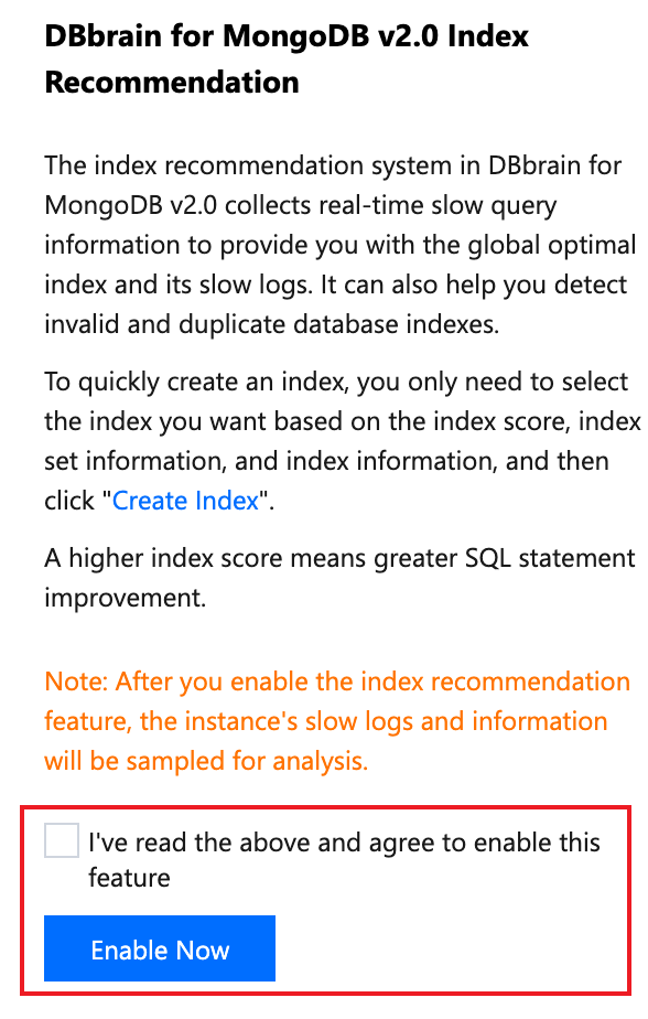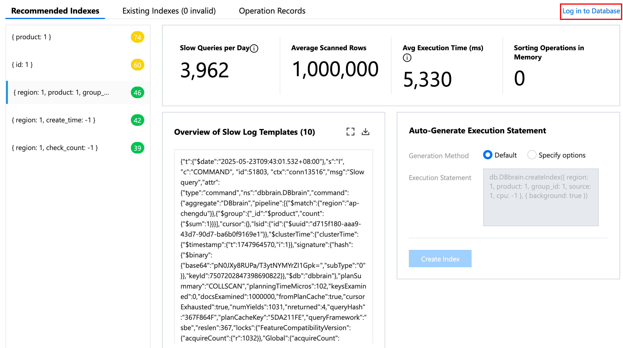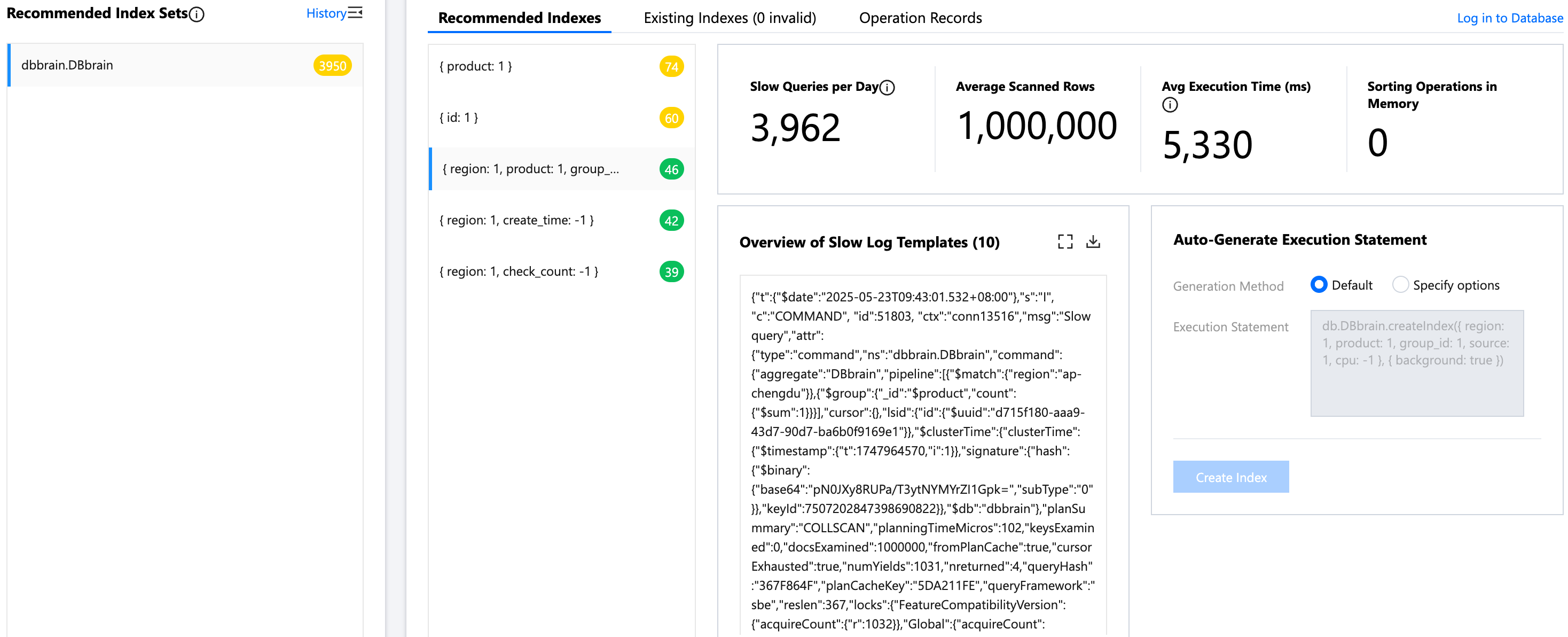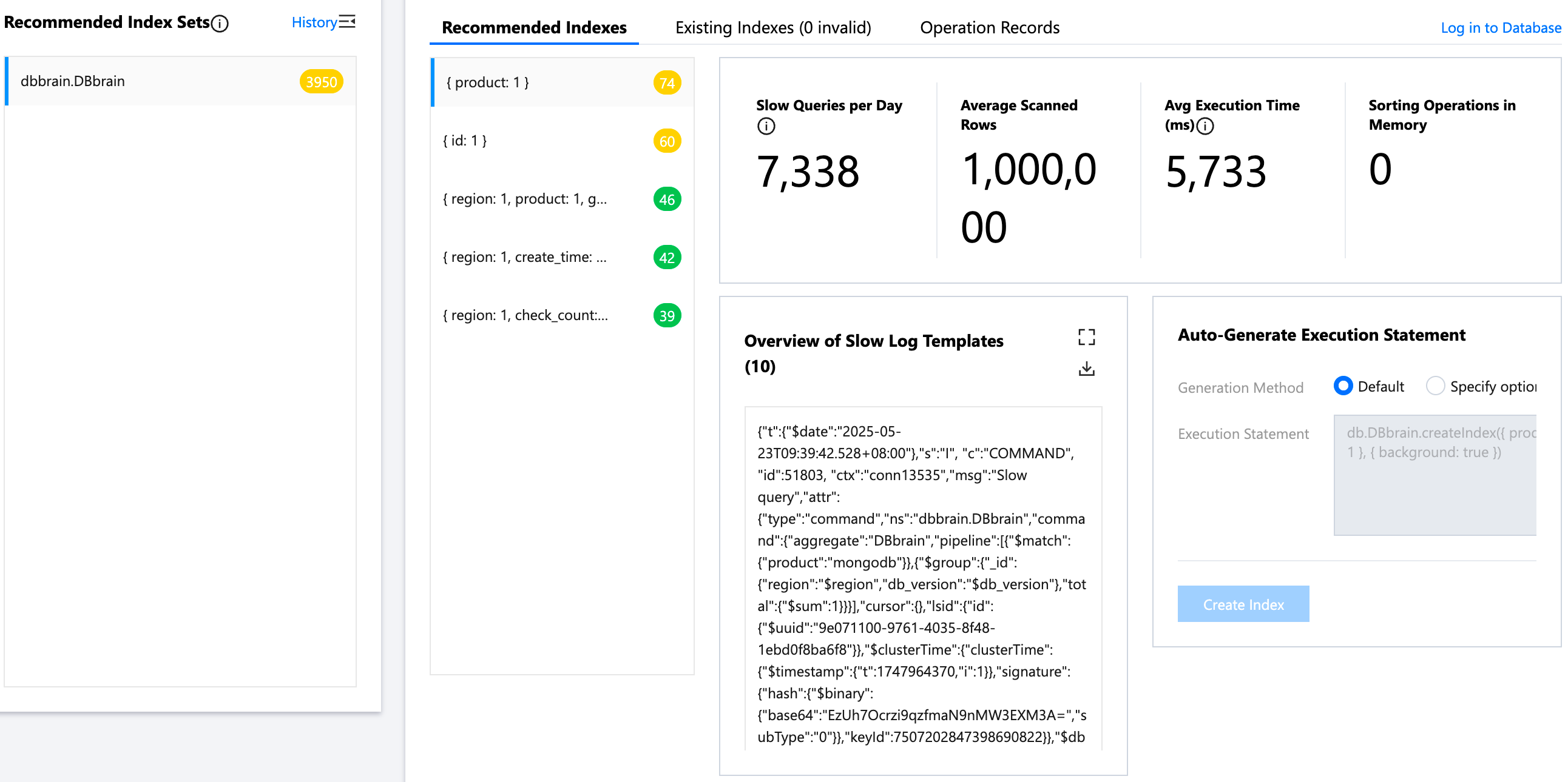 Index optimization is an important part of database optimization. An optimal index can improve the query efficiency of the entire database. In view of the Ops characteristics of TencentDB for MongoDB, DBbrain offers the index recommendation feature to help you easily increase the global indexing efficiency of your instance.