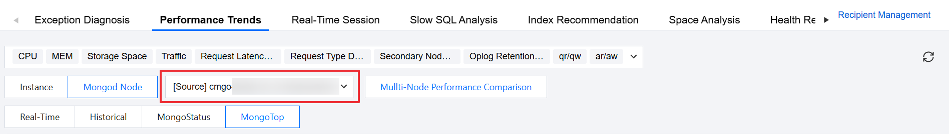 3. Select MongoDB database type and instance ID at the top, and select the Performance Trends tab.