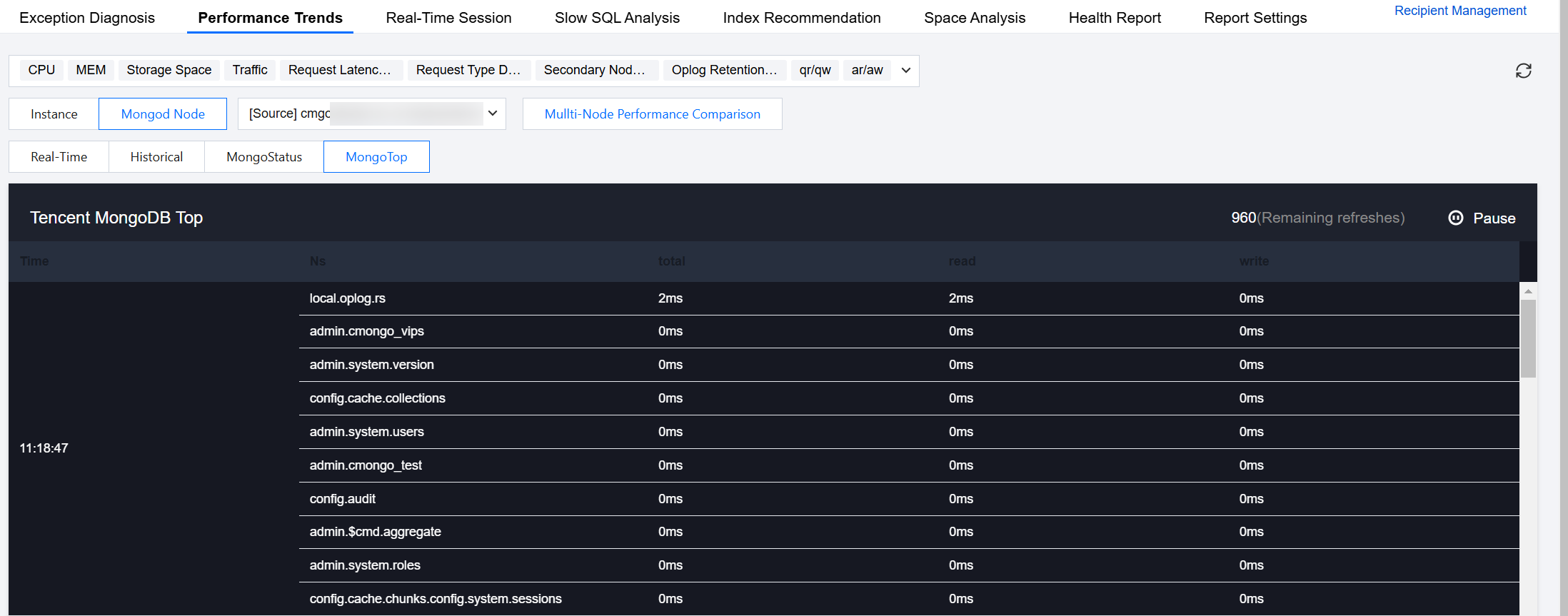 To facilitate daily database Ops, DBbrain provides the TencentDB for MongoDB MongoTop tool. Like MongoDB's official tool, this tool allows you to view the monitoring data of top tables at the node level in real time.
