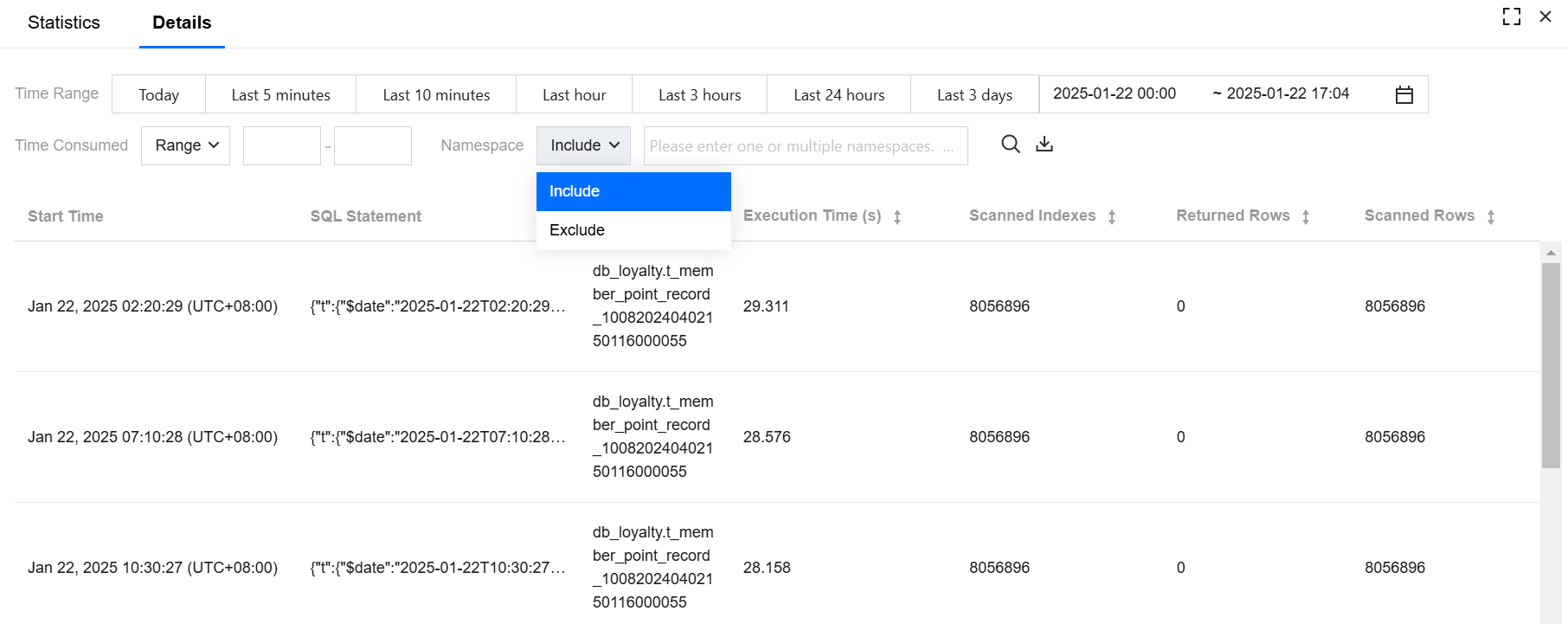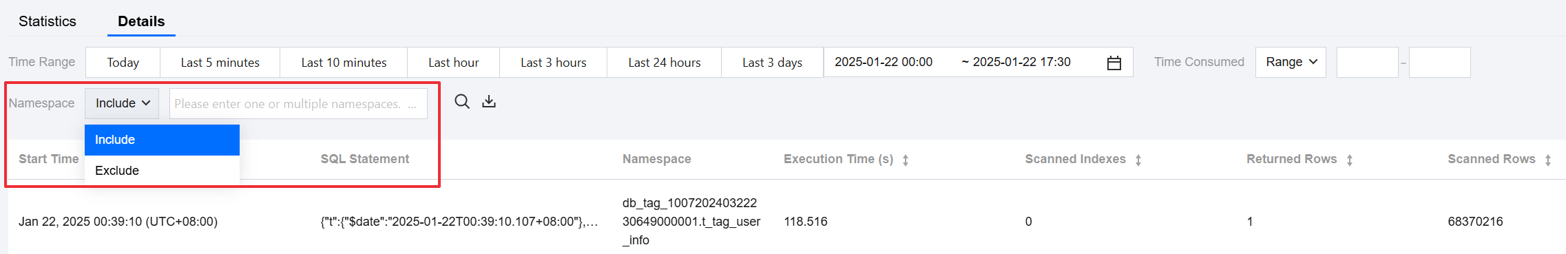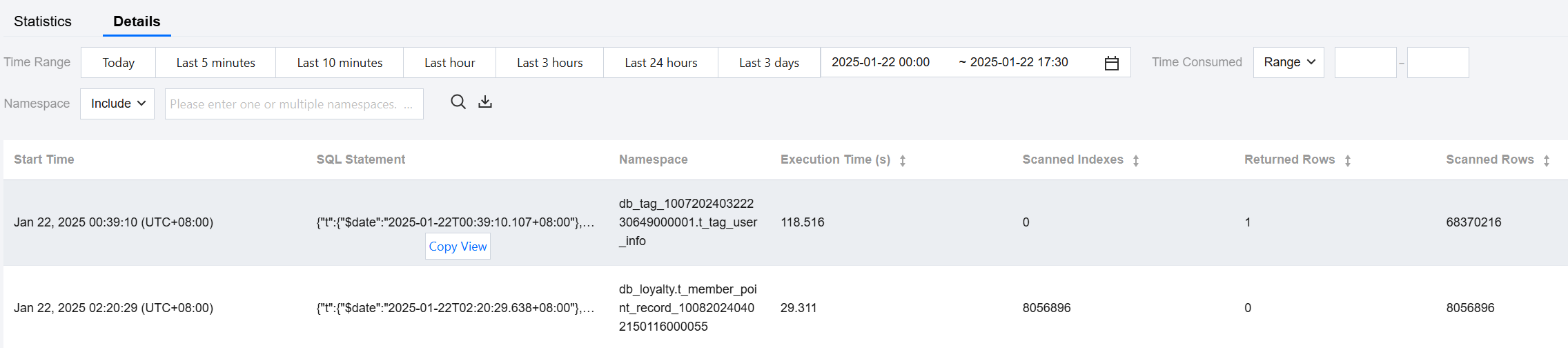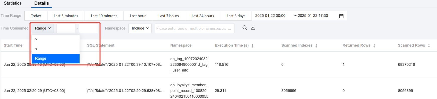6. (Optional) Filter slow SQL statements by time consumption or namespace.