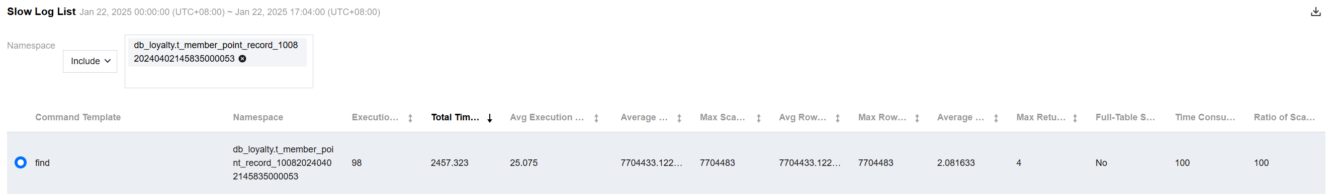 Click a certain time period with slow logs or drag the mouse pointer to select multiple time periods. The segmented time consumption statistics and slow log list will display data information for the selected period in a linked display.