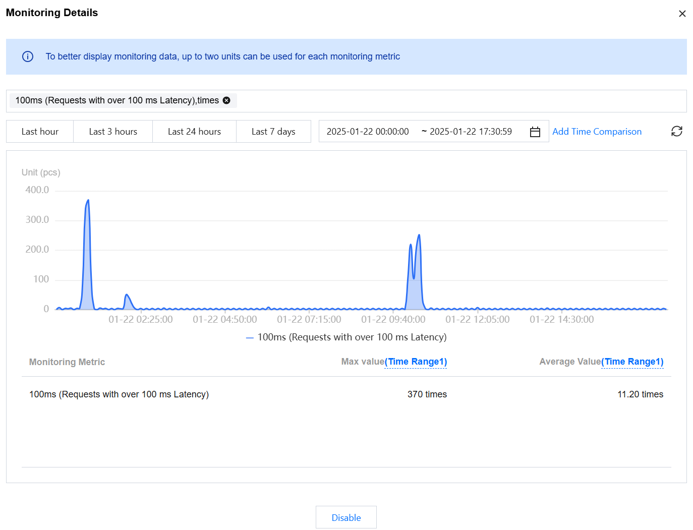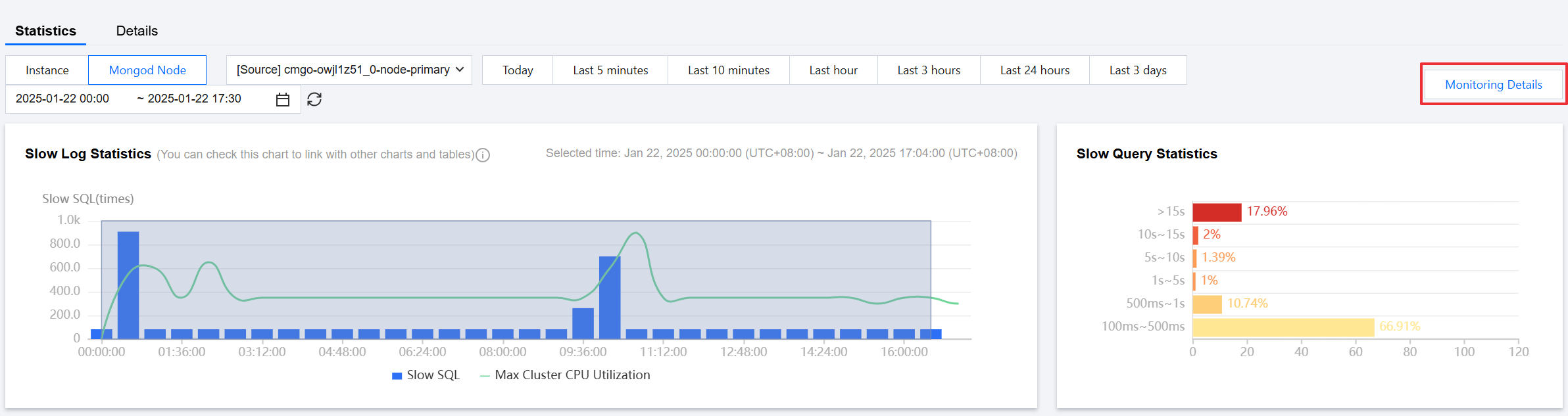If you need to view monitoring metrics details on the Slow SQL Analysis page or compare the monitoring metrics of two time periods, you can click Monitoring Details at the top right of the page.