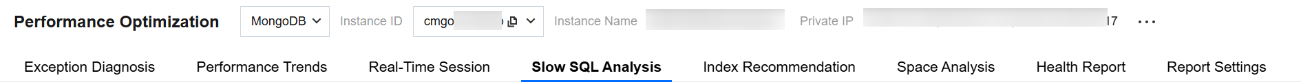3. At the top of the page, select the MongoDB database type and the instance ID to be analyzed.