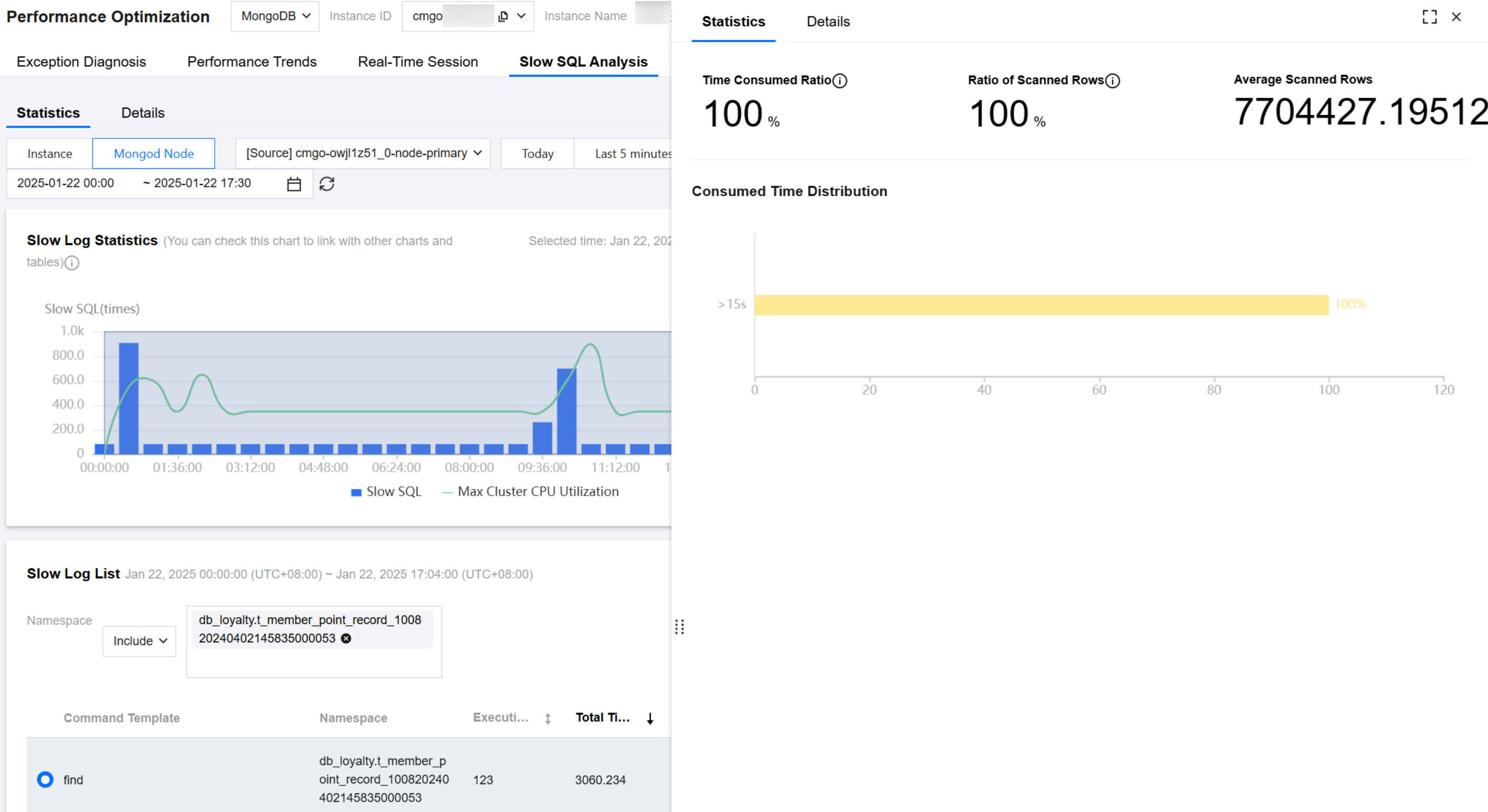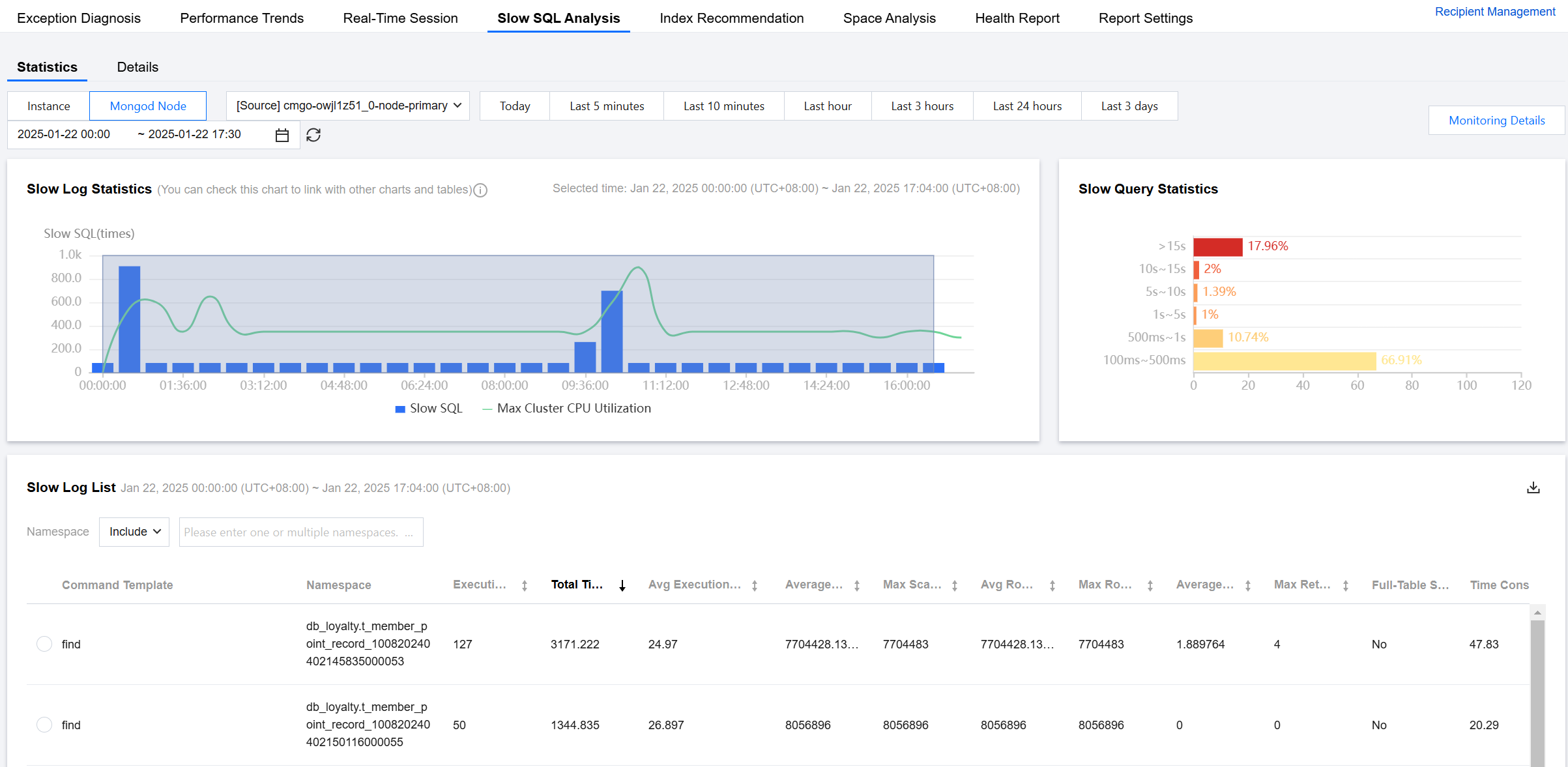 The slow SQL analysis feature calculates, samples, and aggregates slow SQL statements from three dimensions: instance, mongod node, and mongos node. It aggregates slow SQL statistics based on command template and command space, including the number of executions, average execution time, resource consumption (such as CPU), sizes of scan, and result sets. It also supports viewing slow SQL details to help users quickly locate and resolve slow SQL issues.