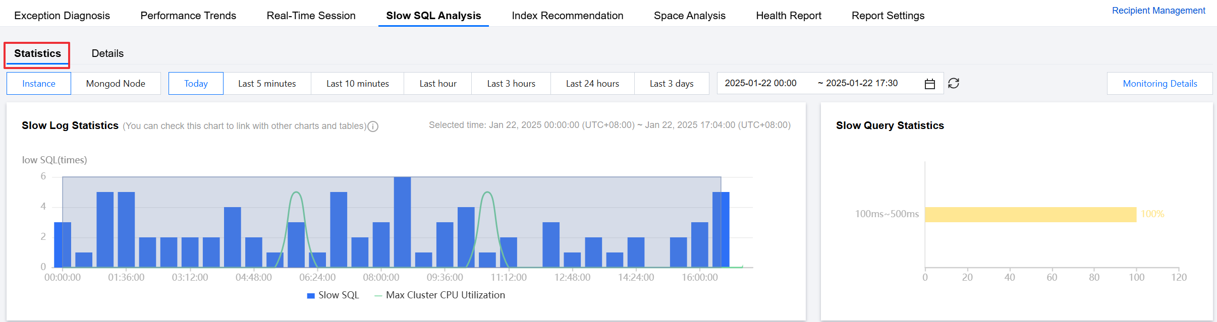 7. View the slow log statistics, segmented time consumption statistics of slow logs, and slow log list.