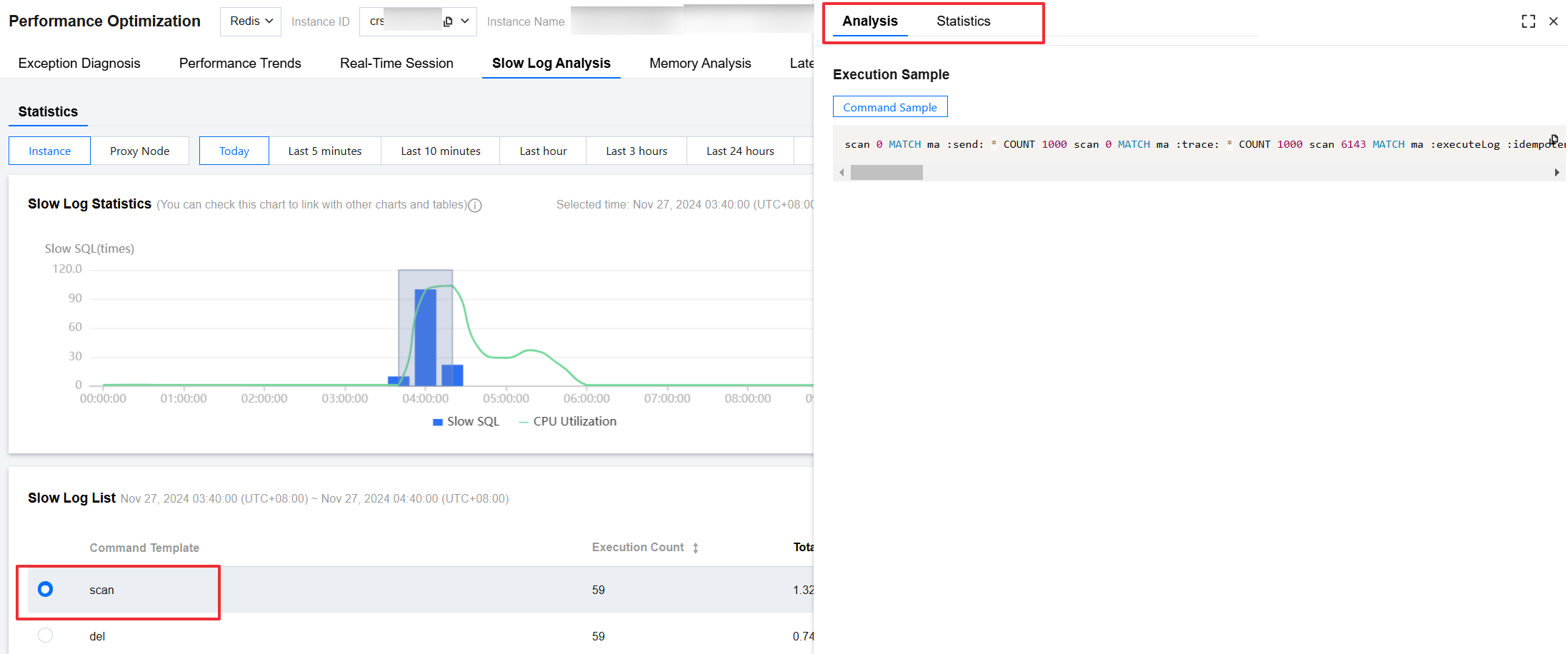 In the instance (Redis database instance) dimension, you can view detailed information such as CPU utilization, the number of slow queries, segmented time consumption statistics of logs, and a comprehensive list of slow logs.