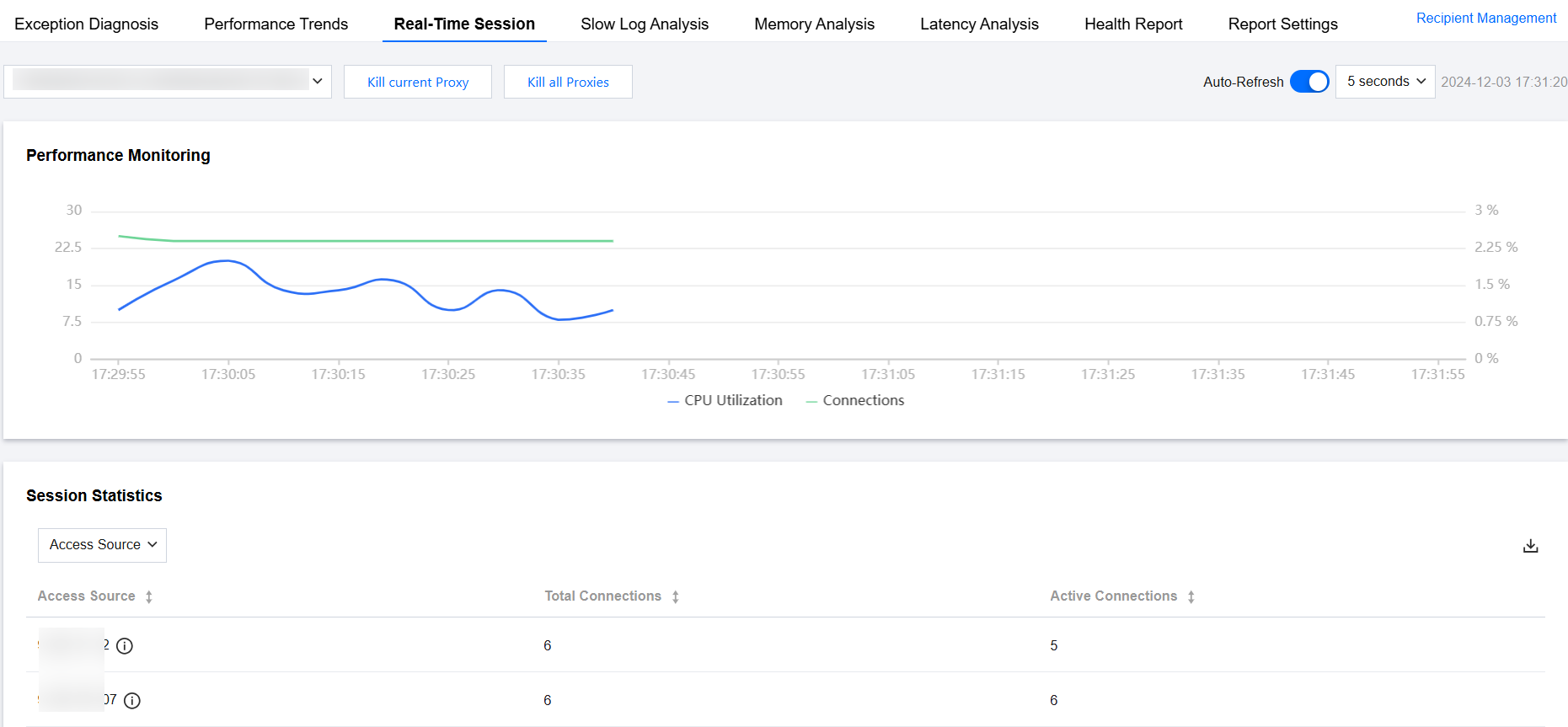 Kill sessions. DBbrain supports killing client connections of the selected Redis instance's current Proxy or all Proxies.