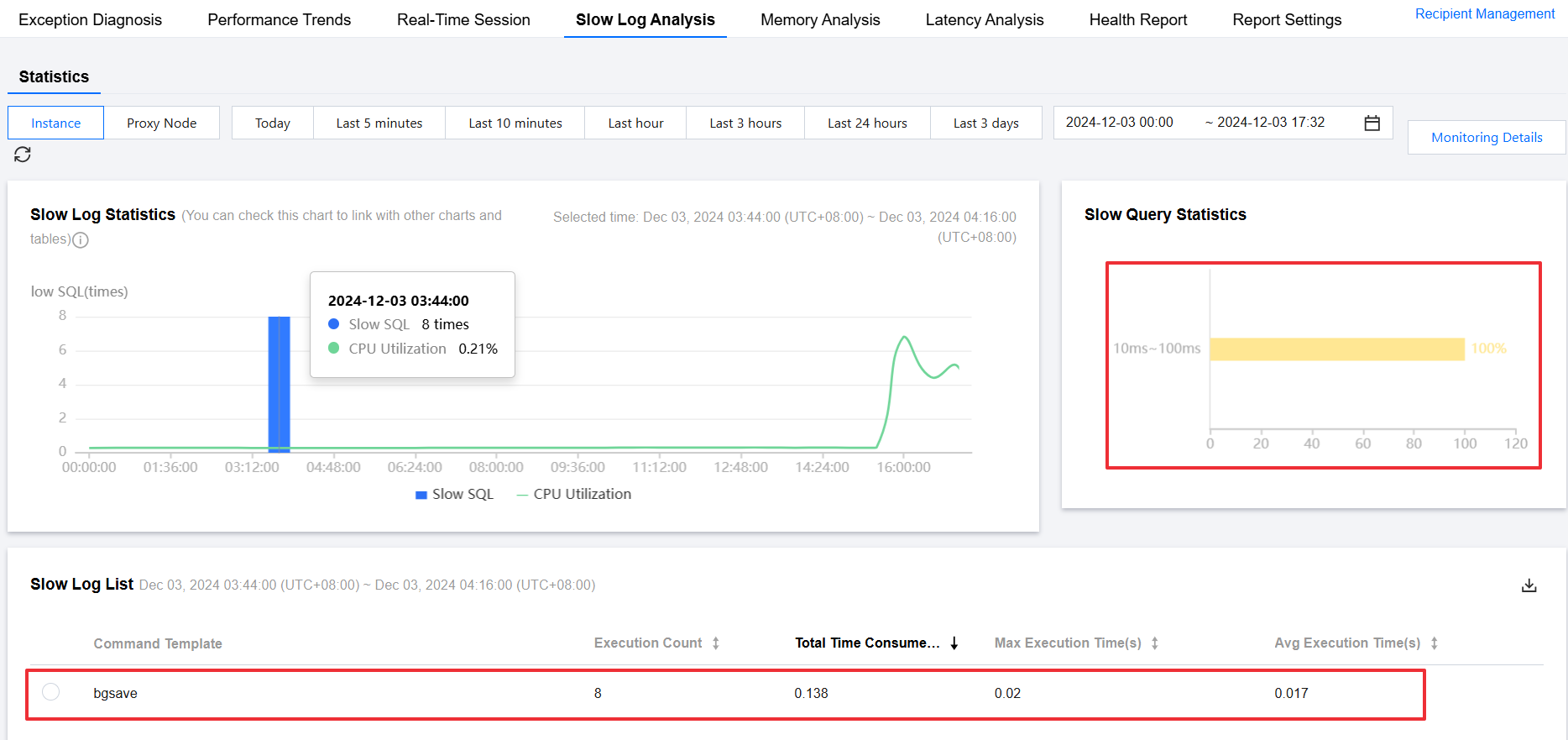 High Time Complexity Commands (such as sort, sunion, and zunionstore) | Redis executes commands in a single-threaded manner, meaning that high-complexity commands can potentially block the execution of other commands. The higher the time complexity of a command, the more resources it consumes during execution, which can result in slow logs and an increase in CPU utilization. | Use the Performance Optimization > Slow Log Analysis feature to check for complex commands in the slow log information list. For detailed troubleshooting methods, see Troubleshooting Complex Commands.