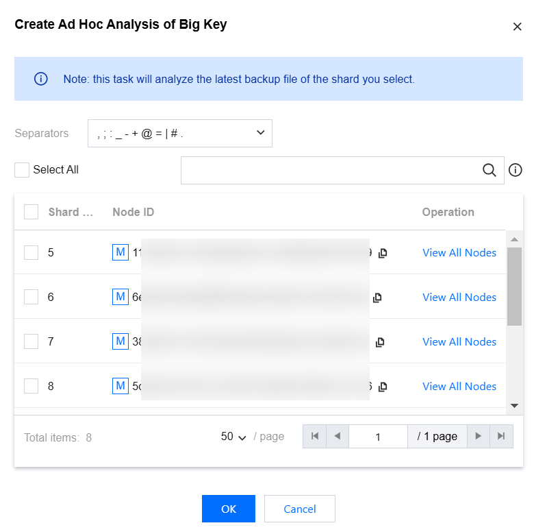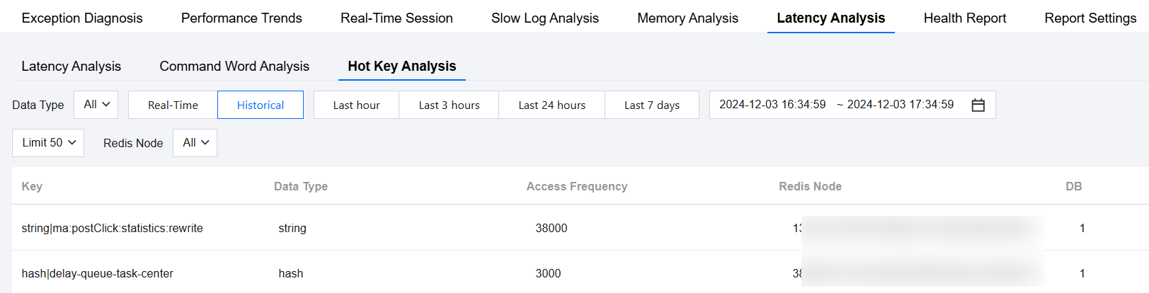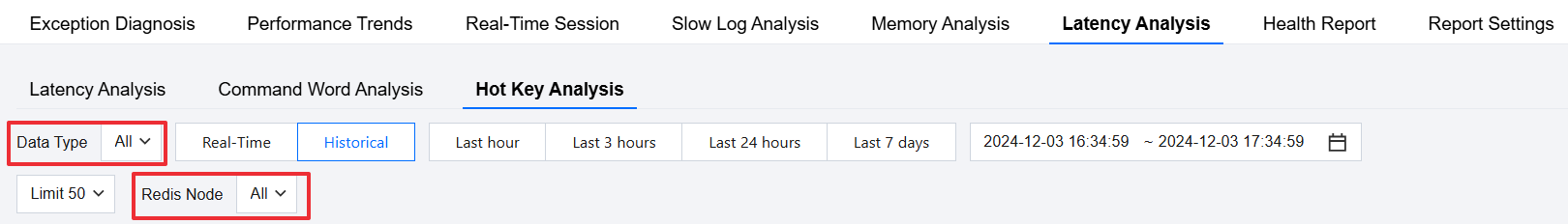 3. On the Hot Key Analysis page, select Database Type as All. If you know the specific Redis node, select the Specific Node; if not, select All Nodes.