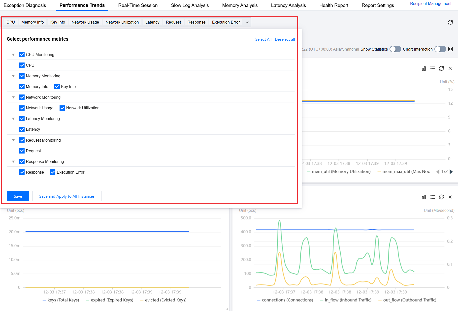 4. Click the Performance Metrics drop-down list and select CPU Monitoring and Request Monitoring performance metrics.