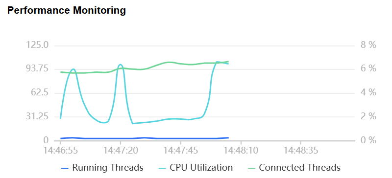 Performance monitoring data includes Running Threads (number of running threads), CPU (CPU utilization), Connected Threads (number of connected threads).