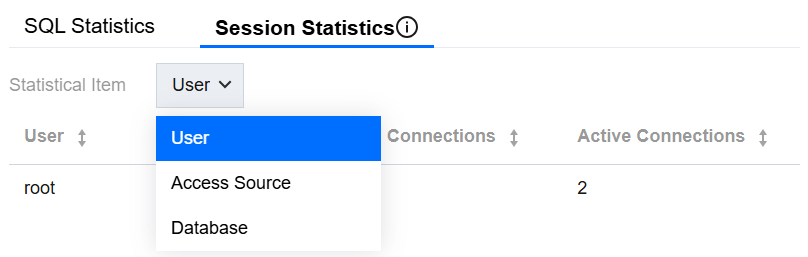 Select the Session Statistics tab, and select the statistics items (including user, access source, database) to collect real-time session data in different dimensions.