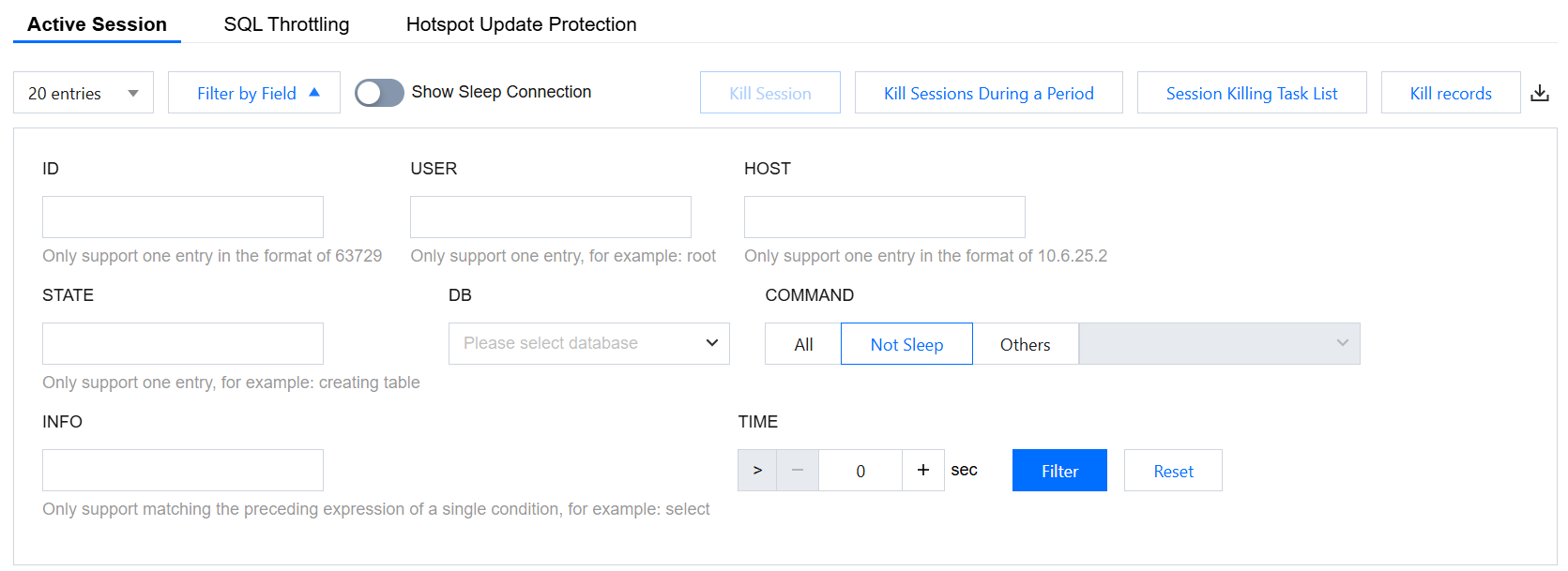 COMMAND | SQL command type, including ALL, Not Sleep, and others. ALL Not Sleep Others: Including Binlog Dump, Change user, Close stmt, Connect, Connect Out, Create DB, Daemon, Debug, Delayed insert, Drop DB, Error, Execute, Fetch, Field List, Init DB, Kill, Long Data, Ping, Prepare, Processlist, Query, Quit, Refresh, Register Slave, Reset stmt, Set option, Shutdown, Sleep, Statistics, Table Dump, and Time. |