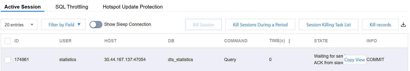 The following operations are also supported by hovering over the corresponding INFO column of the session: