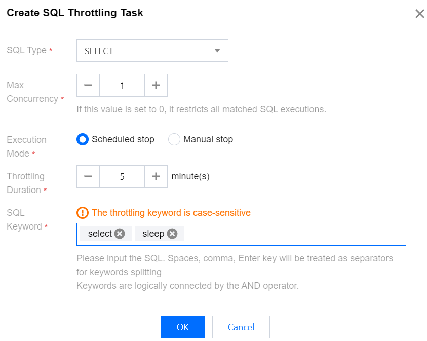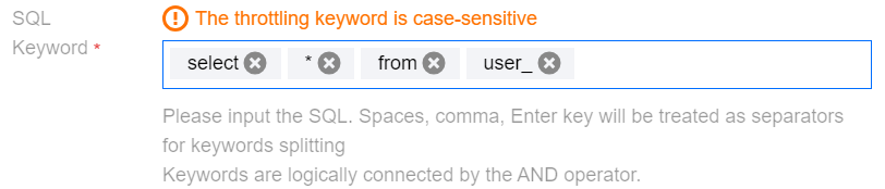 SQL Keyword | It indicates the SQL keywords that require traffic throttling. You can enter SQL statements. The system will automatically split the keywords using space, comma, and line break as delimiters. The logical relationship between multiple keywords is AND, regardless of order. |