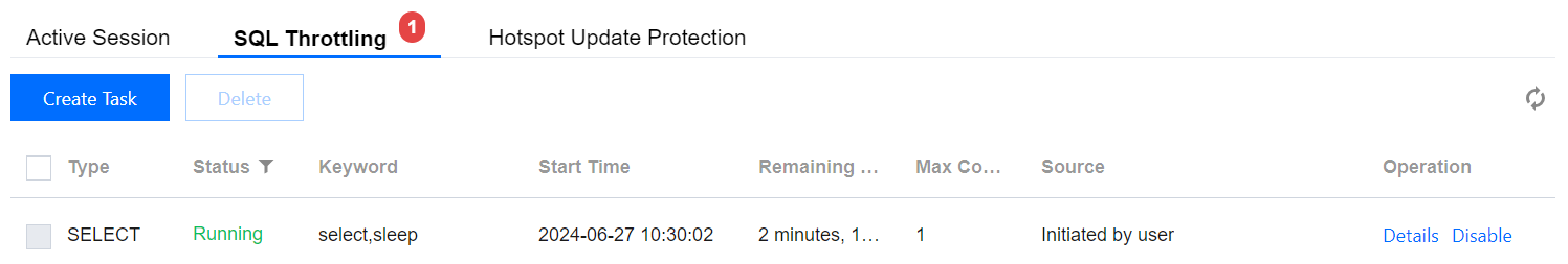 Operation | View task details: Click Details in the Operation column to view the task's start time, execution time, end time, and rejected SQL count. Close task: When you need to terminate a task with the status Running, click Close in the Operation column. Delete task: When you need to delete a task with the status Terminated or Completed, you can delete tasks individually or in batches. Single deletion: Click Delete in the Operation column of the corresponding task. Batch deletion: Select one or more tasks to be deleted in the hot spot update protection task list, and click Delete at the top of the task list. |
