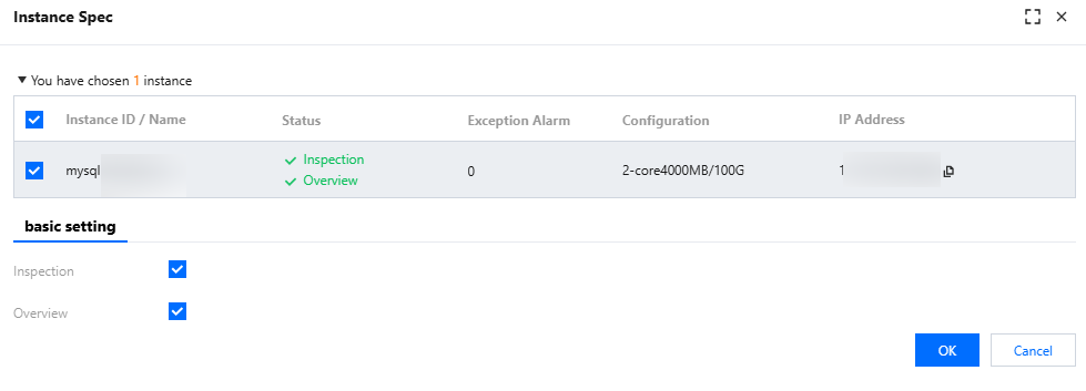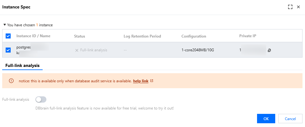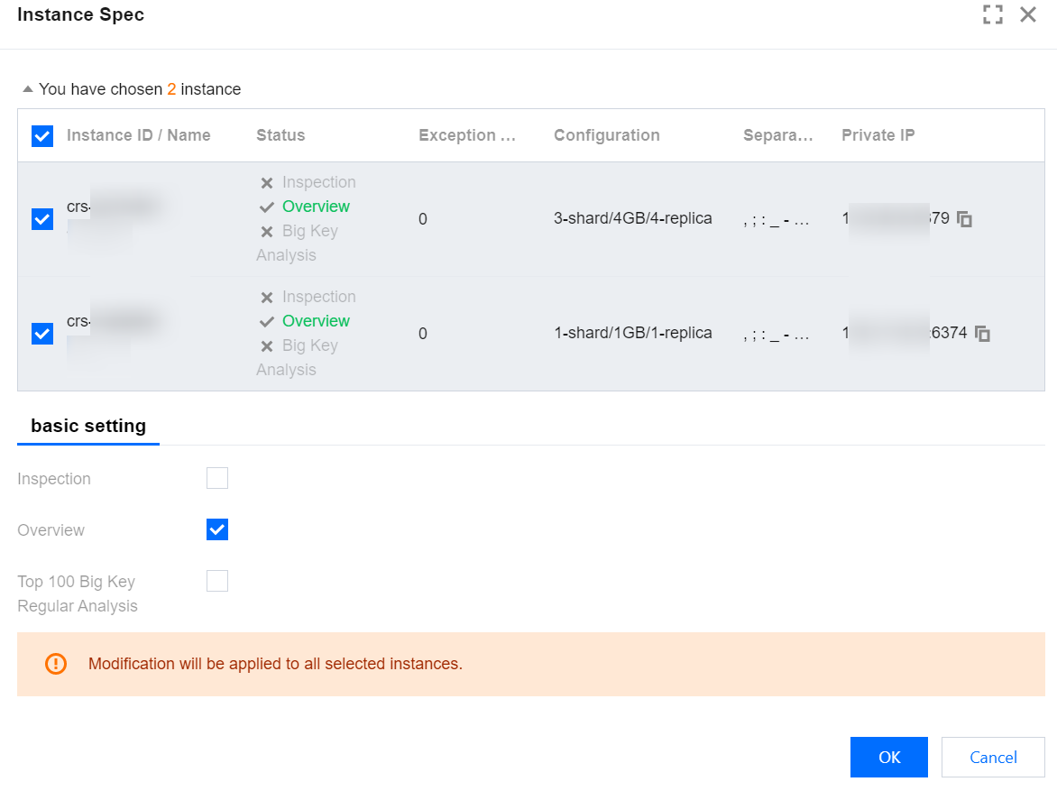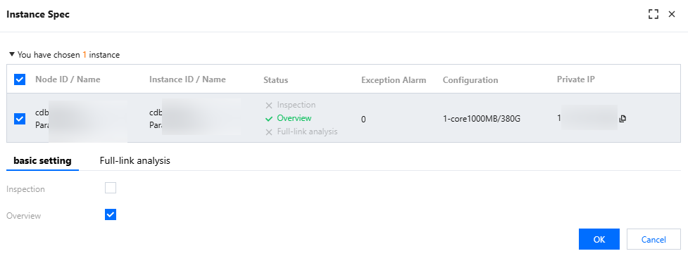 6. In the Instance Spec pop-up on the right, view and confirm the instance or shard information. Select to enable or disable database inspection, overview, full-link analysis, and big key analysis. Click OK.