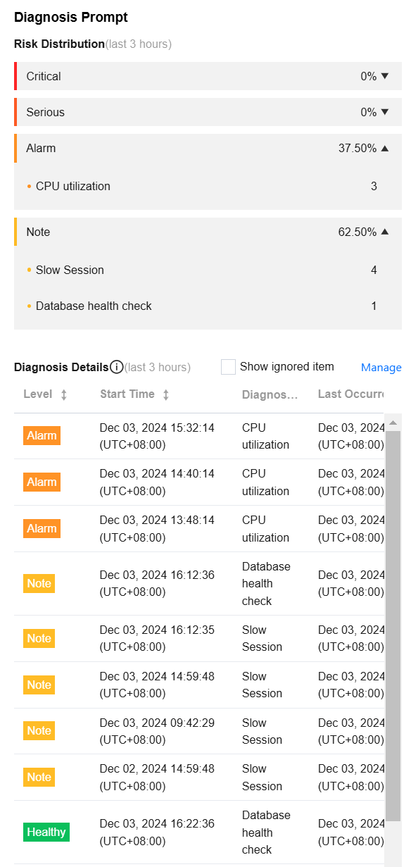 Full Table Scan | Availability | An operation that does not use an index in the query but scans the entire table. | Critical: rows scanned during a full table scan > 10 * N (where N is the configured value for the number of rows scanned during a full table scan, default value: 500). Serious: 10 * N > rows scanned during a full table scan > 5 * N (where N is the configured value for the number of rows scanned during a full table scan, default value: 500). Alarm: 5 * N > rows scanned during a full table scan ≥ N (where N is the configured value for the number of rows scanned during a full table scan, default value: 500). |