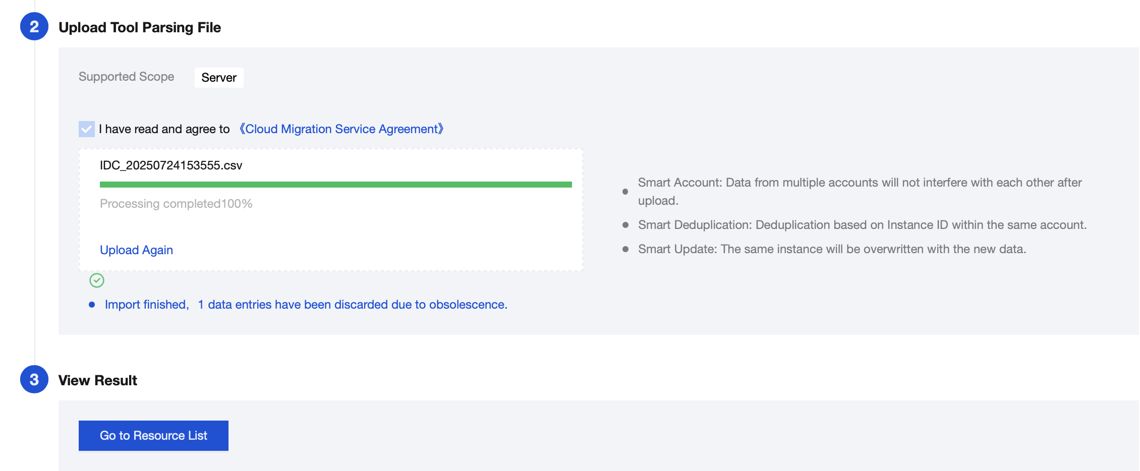 1. Enter Cloud Migration console, go to Source Resource Collection > IDC > Tool Research, and upload the IDC_timestamp.csv file generated by the research tool. 2. After parsing is completed, click Go to Resource List to view.