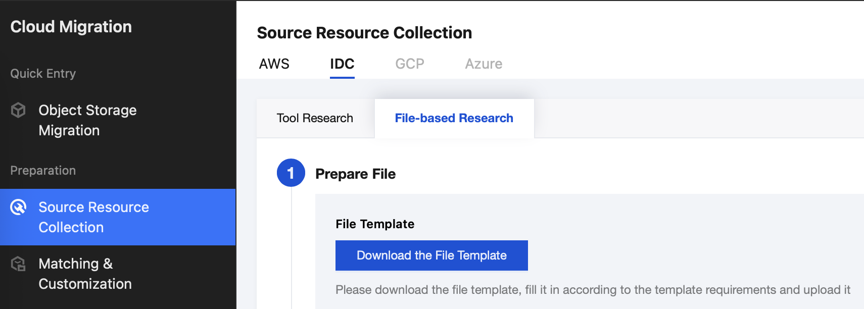 Log in to the Cloud Migration console, select Source Resource Collection > IDC > File-based Research, and click Download the File Template. Step 2: Fill in Source Resource Information